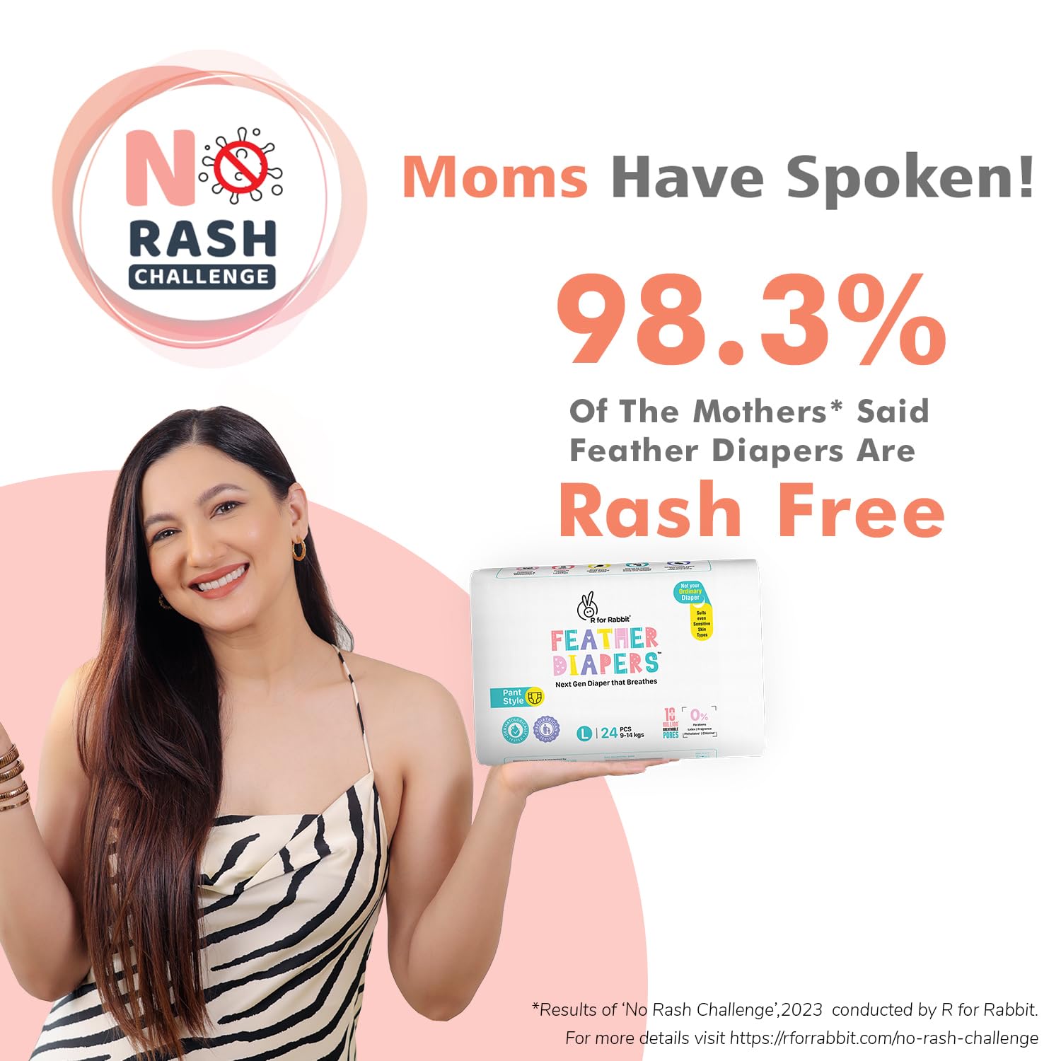 • Breathable Diapers: R for Rabbit Feather Large Size Diapers for L size having 10 Million* Breathable pores which allows the air to easily pass through making the diapers highly breathable and acting as a rash guard for your baby by instantly locking moist