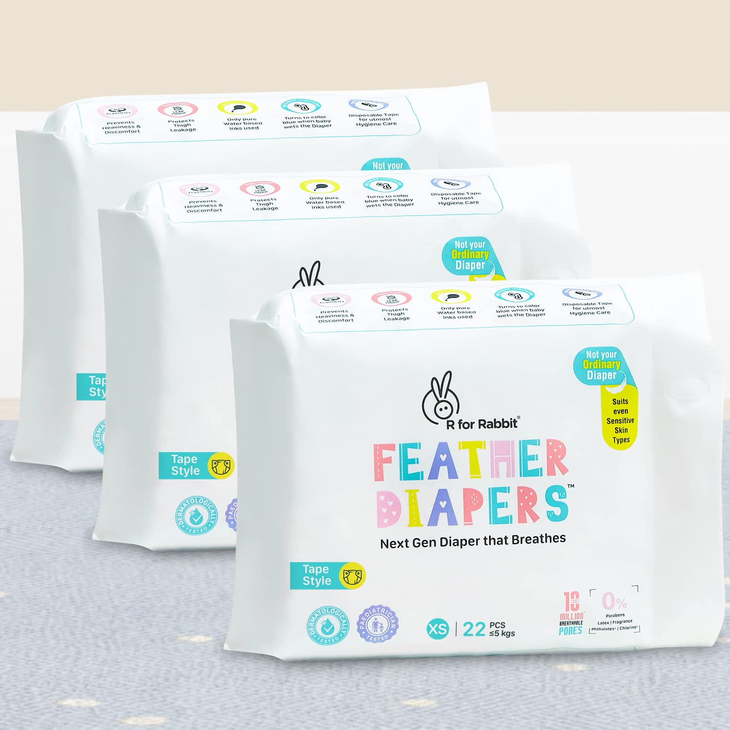 • Breathable XS new born Diaper: R for Rabbit Feather Diapers for XS size having 10 Million* Breathable pores which allows the air to easily pass through making the diapers highly breathable and acting as a rash guard for your baby by instantly locking mois