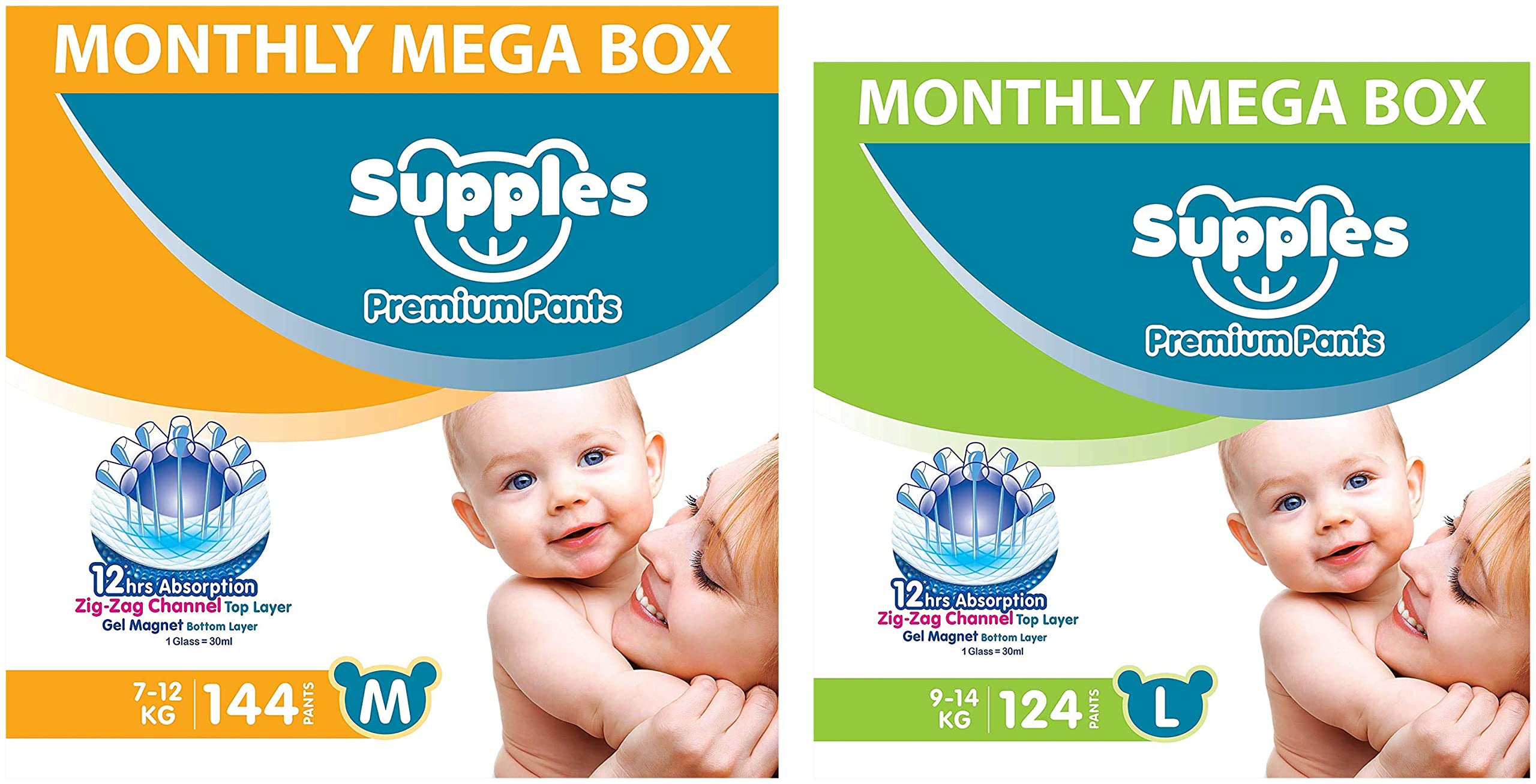 Supples Baby Diaper Pants Monthly Mega-Box X-Large 108 CountThese diaper pants keep your baby comfortable in the day as well as in night. Their cottony soft material is gentle on your baby skin keeping their precious skin perfect.Supples Baby Wet Wipes with Aloe Vera and Vitamin E - 72 Wipes/Pack (Pack of 3)Infused with the goodness of aloe vera and vitamin e the Supples baby wipes are a handy way to keep your baby's delicate skin refreshed and clean. The Supples baby wipes are 100 percent free from alcohol parabens soap chlorine and other toxic elements and thus entirely safe for everyday use. Take it anywhere you go with your baby and protect your little one from skin infections.