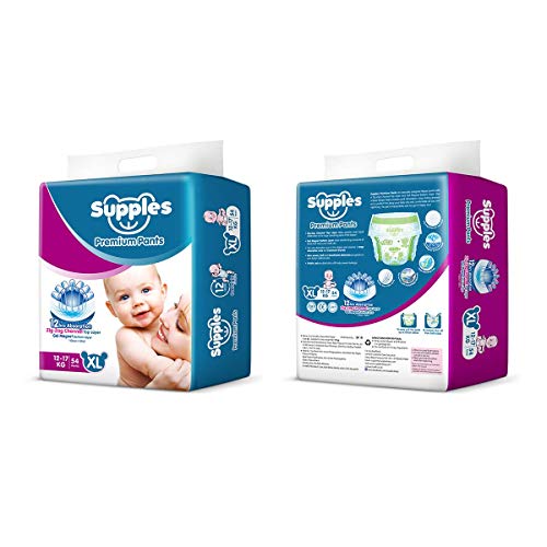 Supples Baby Pants Diapers X-Large 54 CountThese diaper pants keep your baby comfortable in the day as well as in night. Their cottony soft material is gentle on your baby skin keeping their precious skin perfect.Supples Baby Diaper Pants Monthly Mega-Box X-Large 108 CountThese diaper pants keep your baby comfortable in the day as well as in night. Their cottony soft material is gentle on your baby skin keeping their precious skin perfect.