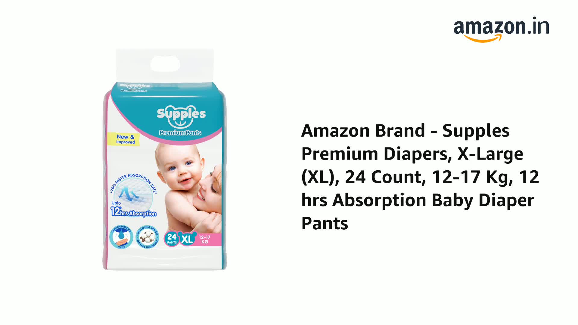 Amazon Brand - Supples Premium Baby Diaper Pants | 24 Baby Diapers | XL | 12-17 Kg | 12 Hrs Absorption | Cushiony Cotton Soft Fabric | Phthalates-Free | Triple Leak Guard