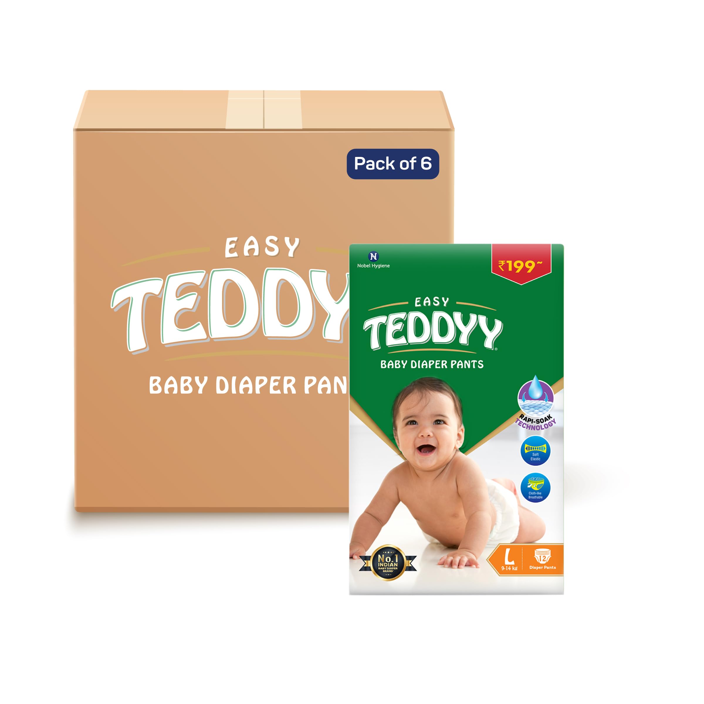TEDDYY Baby Diapers Pants Easy Large 72 Count (Pack of 6), 9-14 kgs, 12 hrs Leak Protection, Anti - Bacterial