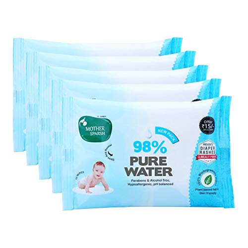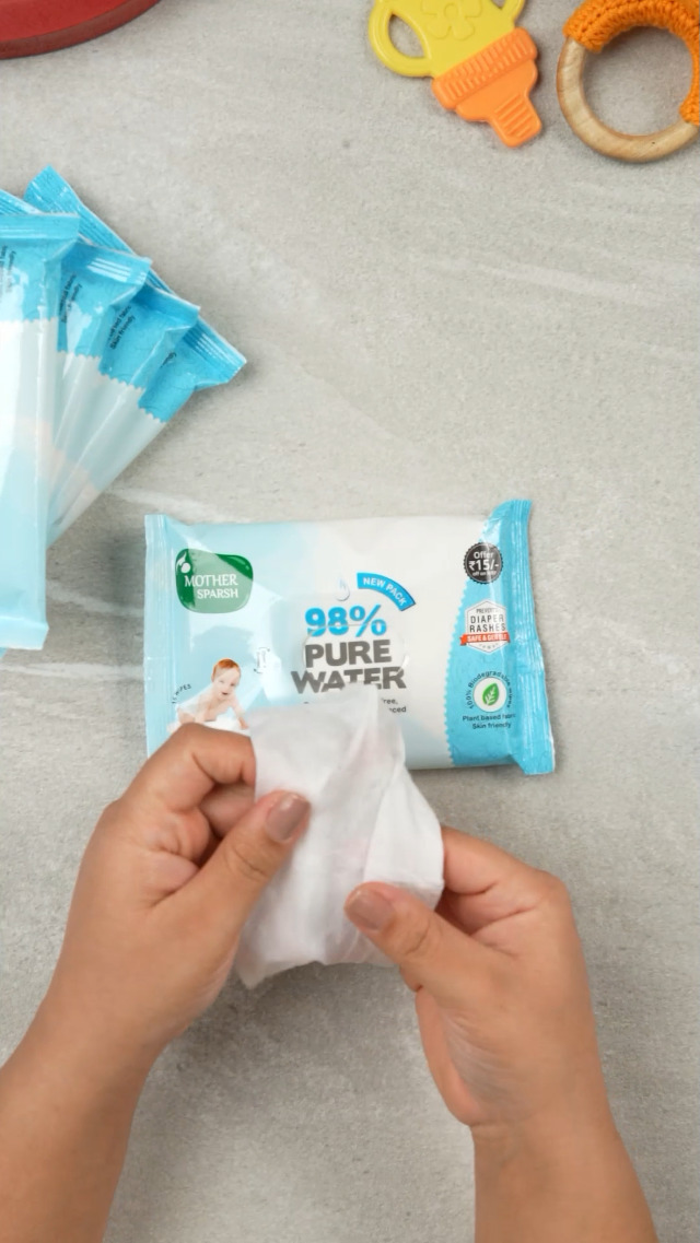 No need to go anywhere else we bring you the cure from all your babyâs mess. You can clean your little munchkin in just one go with our Mother Sparsh 98% Water-Based Wipes (Mildly Scented). Made with 98% water and plant based fabric they are skin friendly and suit all types of skin. With the mild scent present it covers babyâs body odour especially at bum areas. Also it prevents the babyâs skin from diaper rash or any irritation. These Eco-friendly and biodegradable wipes wonât even harm the environment around you.