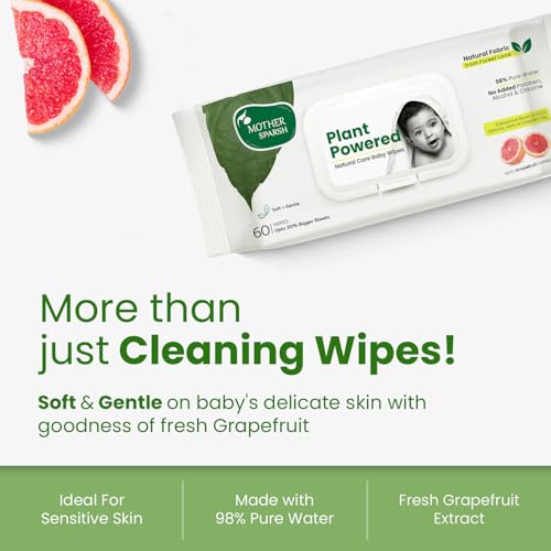• WITH 98% PURE WATER: Mother Sparsh Plant Powered Natural Baby Wipes for babies are made with 98% pure water. The Plant-Based fabric of the baby wipes absorbs impurities cleanses gently soothes the baby's skin and keeps it moisturized.