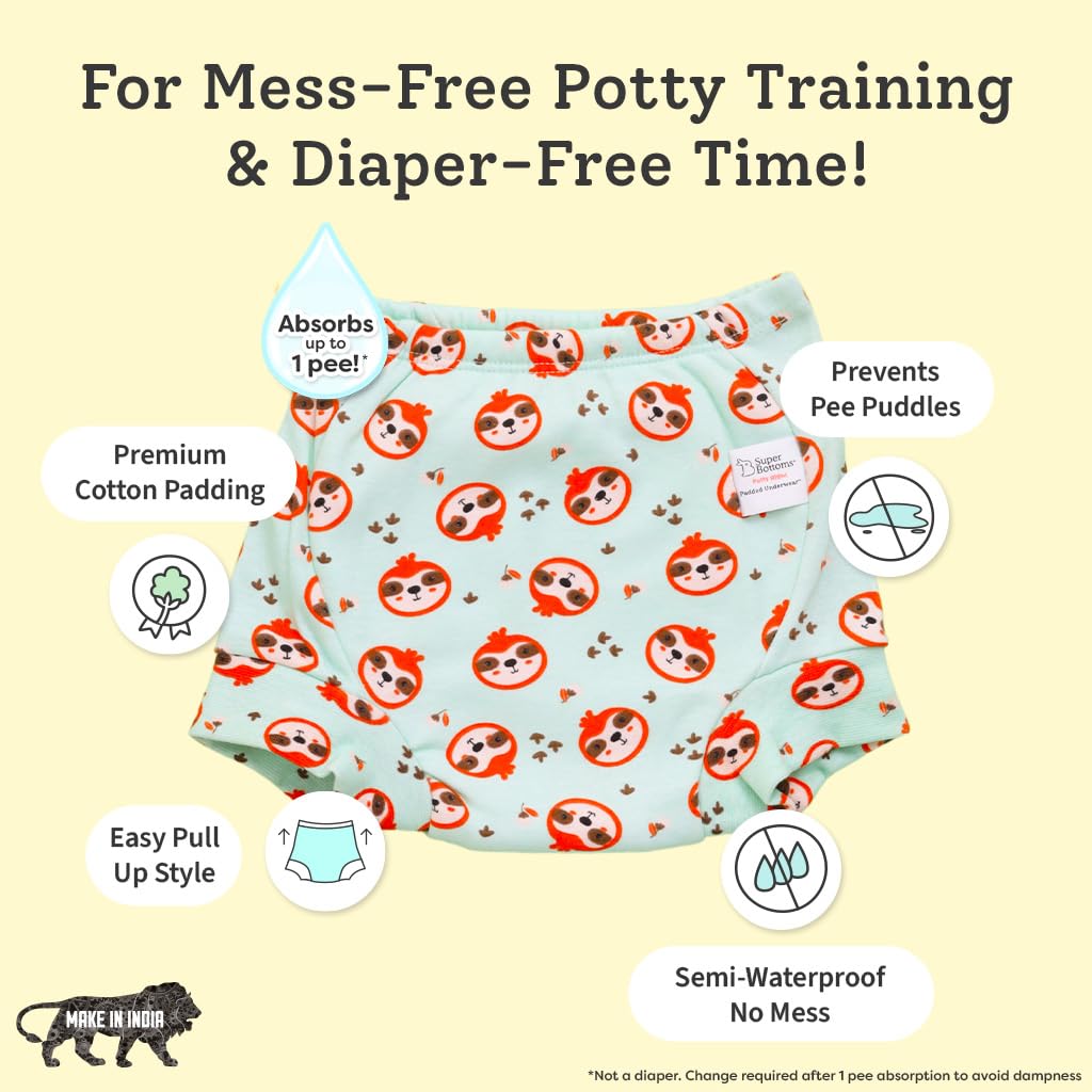 COTTON PADDING: SuperBottoms Padded Underwear has 3 Layers of 100% cotton padding which helps in preventing leaks and messy pee accidents. It is Semi waterproof and has a SuperDryFeel Layer on top to avoid a pool around the baby.