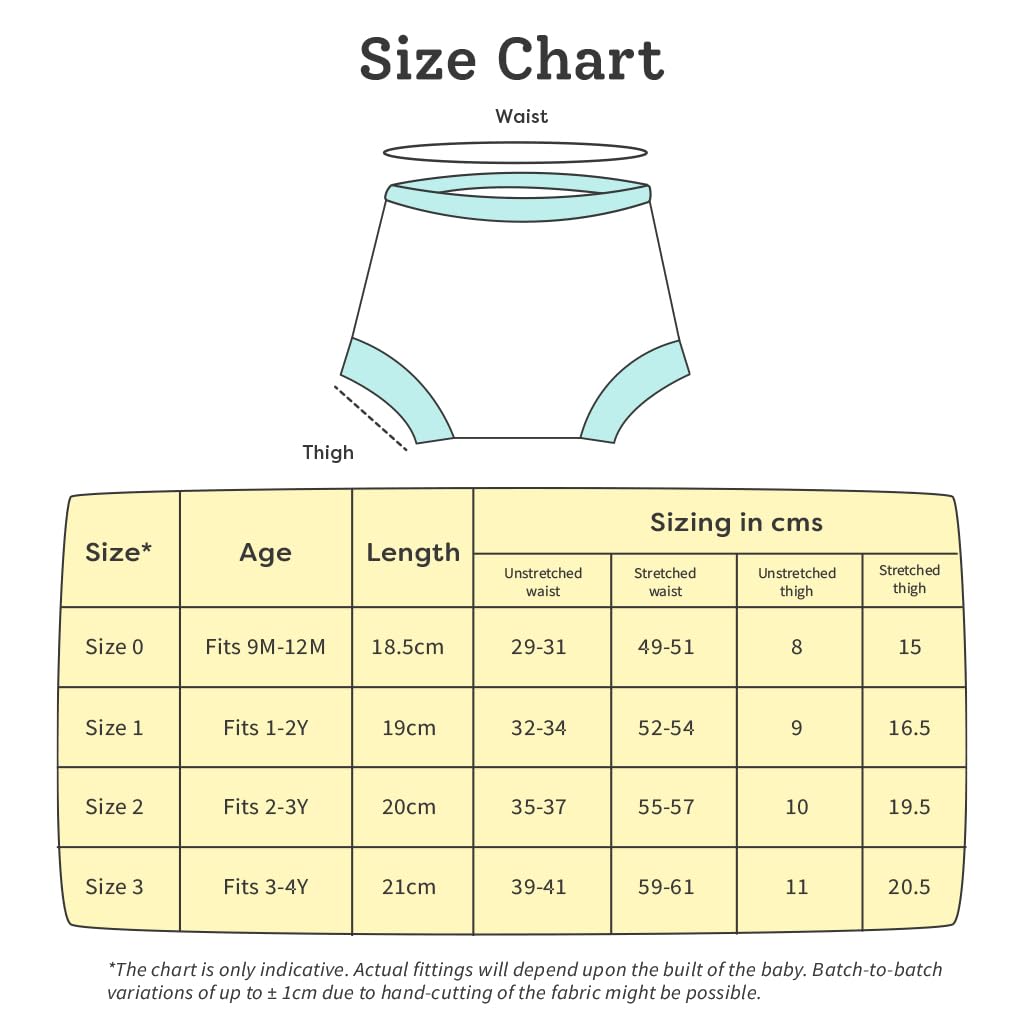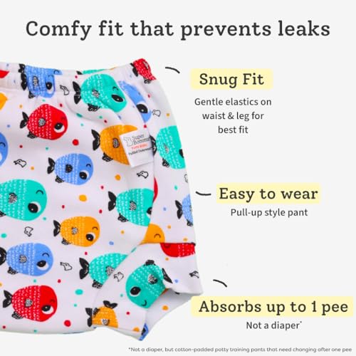 COTTON PADDING: SuperBottoms Padded Underwear has 3 Layers of 100% cotton padding which helps in preventing leaks and messy pee accidents. It is Semi waterproof and has a SuperDryFeel Layer on top to avoid a pool around the baby.