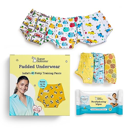 superbottoms 6 Padded Underwear + Xtrahydrating Wipes-40 Pack|3X Thicker Premium Wet Wipes|98% Pure Water|Potty Training Pants|3-Layers Of Padding&Superdryfeel Layer|Pull-Up Style-Size3Baby 1 Count