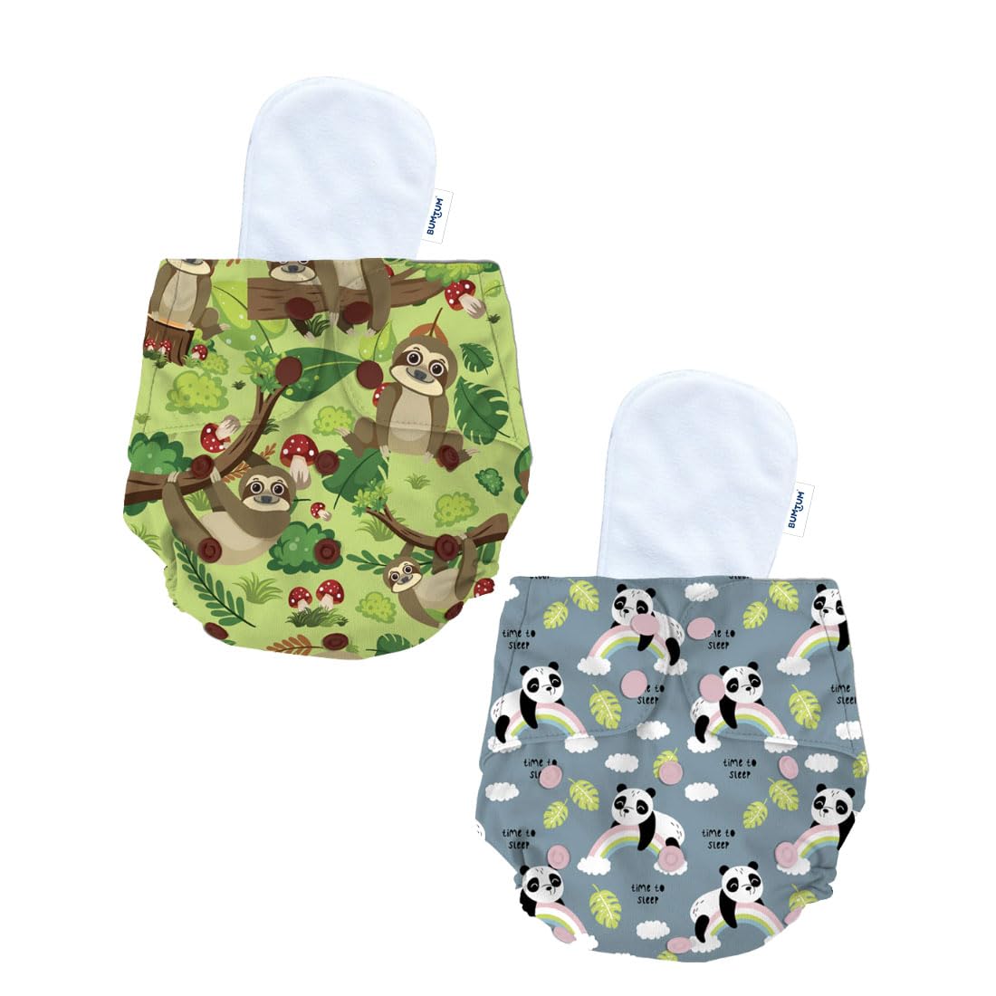 Bumtum Baby Diaper | 0-3 Yrs Baby Freesize | Pack of 2, New Born Baby Diaper, Cloth Diaper, Waterproof Reusable Diaper, 5hrs Absorbency, Washable, Cotton Soaker, Extra Soft (Panda & Sloth)