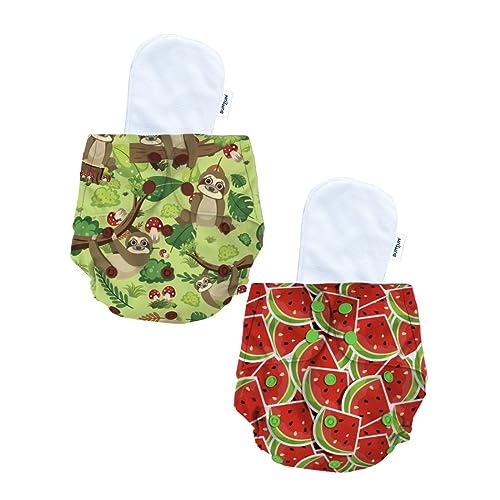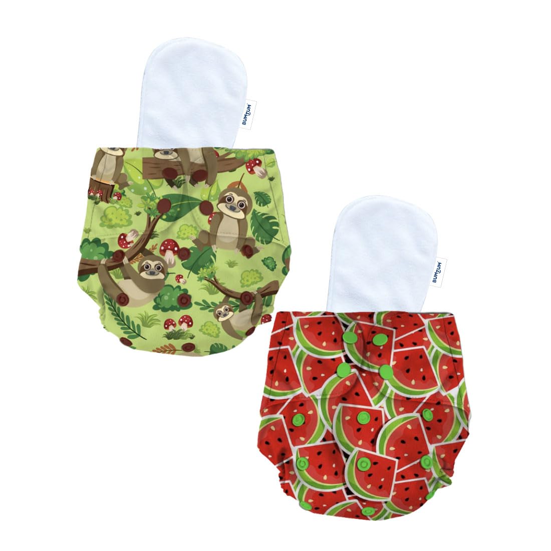 Bumtum Baby Diaper | 0-3 Yrs Baby Freesize | Pack of 2, New Born Baby Diaper, Cloth Diaper, Waterproof Reusable Diaper, 5hrs Absorbency, Washable, Cotton Soaker, Extra Soft (Sloth & Watermelon)