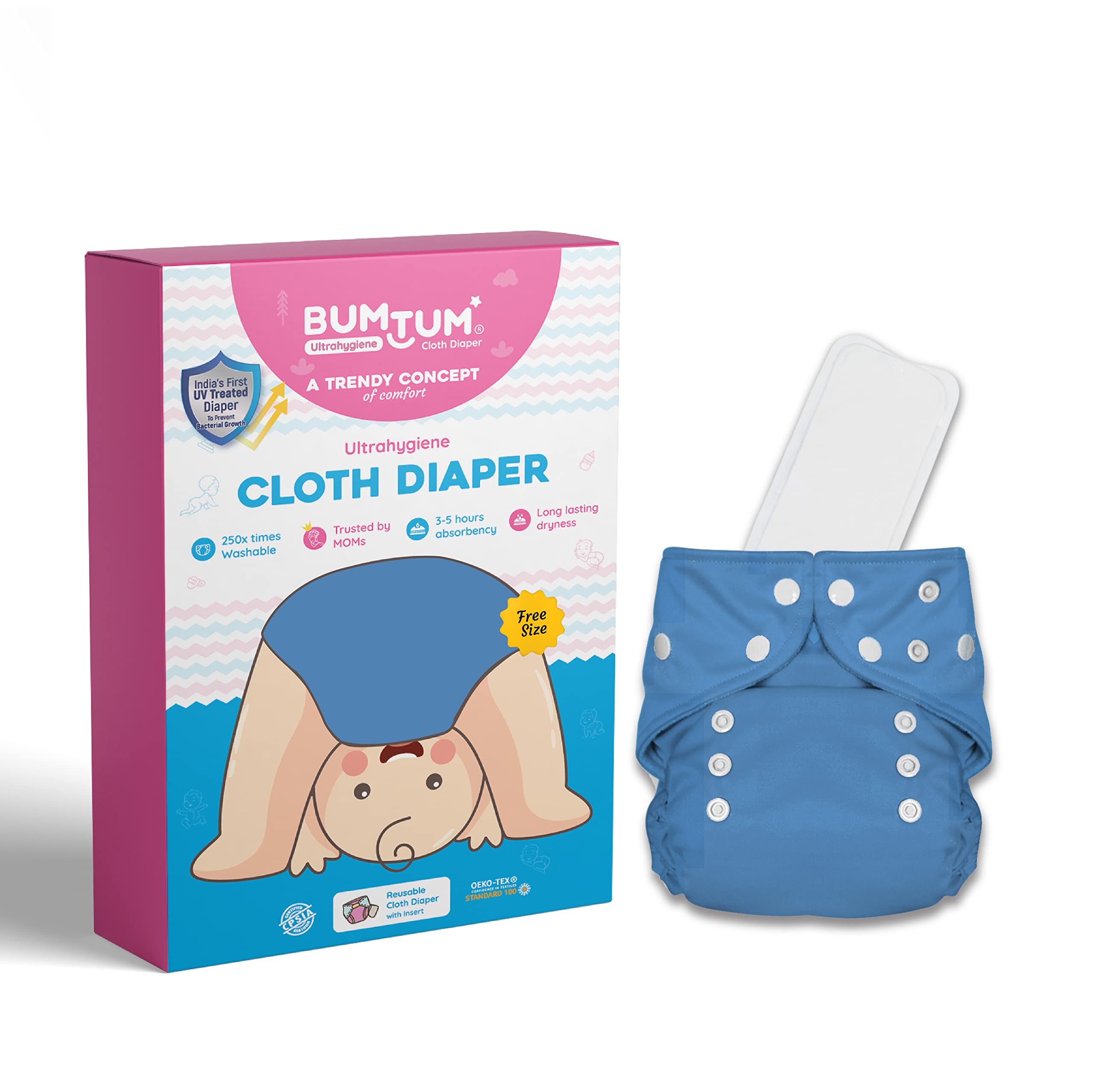 TRENDY ONE SIZE FIT: Bumtum Ultrahygiene Cloth diapers can fit from 5kgs to 17kgs (3 months to 3 years). It is full of comfort as just but one time and stays worry-free for 3 years. It grows with your baby as it's free in size reusable and washable. Just