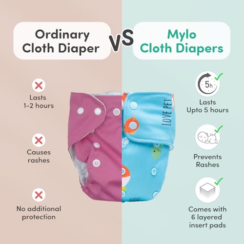 Mylo Leak Proof Baby Cloth Diaper Combo (3 Diaper & 3 Inserts) for 3 Months to 3 Years Babies | Oeko Tex Certified Washable & Reusable Baby Cloth Diaper | Free Size-Celebration Purple Love & Pet Love