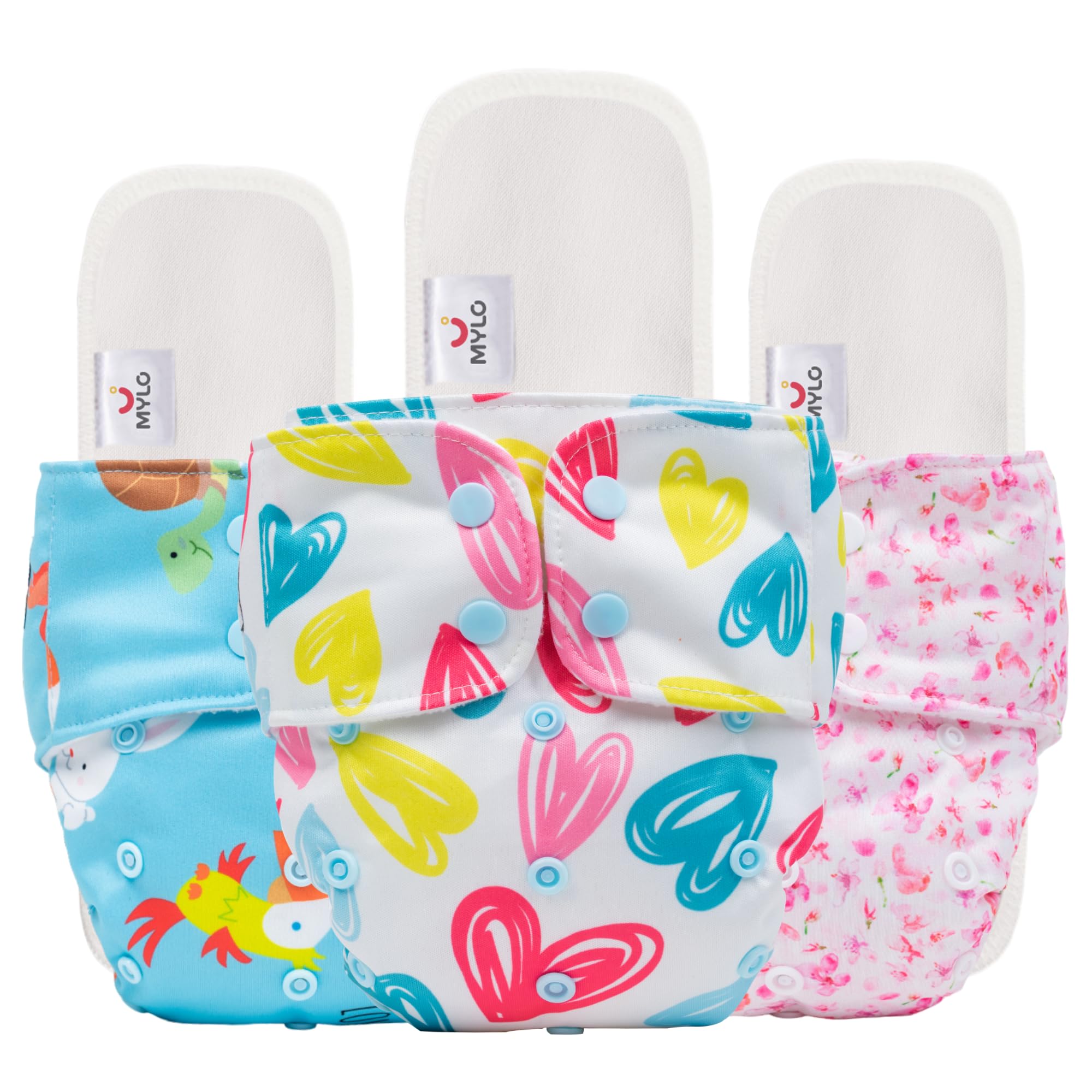 Mylo Leak-Proof Baby Cloth Diaper Combo (3 Diapers + 3 Inserts) | Free Size (3M-3Y) | High Absorption | Quick Dry | Oeko-Tex Certified | Washable - Pet Love, Floral & Heart
