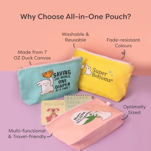 Introducing the SuperBottoms All-in-One Pouch the versatile and eco-friendly solution for all your storage needs. Crafted from high-quality 7 OZ duck canvas this pouch is designed to be your go-to companion for pencils stationery makeup travel essentials coin pouch and more. Whether you're headed to school office or on an adventure this SuperBottoms All-in-One Pouch is your dependable sidekick. It is eco-friendly contains zero harmful chemicals and is completely safe for kids. The premium-quality zip is your partner in crime keeping your treasures safe. Plus the prints are so fierce they won't fade promise! It is suitable for all age groups and is designed with your convenience and the environment in mind. You can use these pouches for storage and as a pouch for sanitary pads. Choose a pouch that's not only stylish but also responsibly made. Get yours today and let the fun times roll!