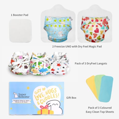 SuperBottoms brings you the perfect gift box to delight the little ones. This gift box contains 2 Freesize UNO (New Version) Pack of 3 DryFeel Langot 1 Booster Pad and 3 Coloured Easy Clean Top Sheets all packed elegantly in a gorgeous-looking box. This is a perfect gift you can give to new parents. Freesize UNO: SuperBottoms Freesize UNO cloth diaper is made from 100% Organic Cotton Pads with Super DryFeel Layer that keeps babys bums dry and helps in reducing rashes significantly. It is a washable and reusable cloth diaper which makes it pocket-friendly as well as eco-friendly. It is ideal for babies from 7 kg - 17 kg. DryFeel Langot: The DryFeel Langot has 3 layers of cotton padding with Super DryFeel Layer on the inside that helps to hold up to 1 pee. The gentle elastics at the back and thighs will give your baby a comfortable fit. Booster Pad: Booster Pad is made of 8 layers of Organic Cotton and is to be used in addition to the Dry Feel Magic Pad for boosting the absorbency of the SuperBottoms Freesize UNO making it ideal for night time use. The foldable design makes the pads dry very fast making them ideal for monsoon and winter seasons. Easy Clean Top Sheets: The Easy Clean Top Sheets are essentially diaper liners with Super DryFeel Layer that stay dry and can be placed over the Dry Feel Magic Pad which helps to easily clean babys poop.