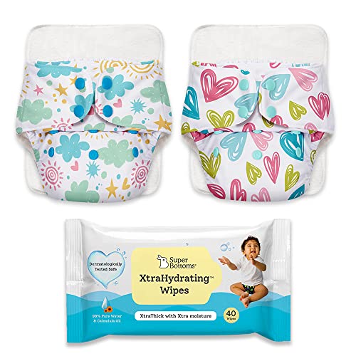 SuperBottoms BASIC - 2 Reusable Cloth Diaper (ASSORTED) | 3m-3Yrs & Pack of 40 XtraHydrating¢ Wipes FREE | Unscented Baby Wipes 3.5x extra moisture | Adjustable Organic Diapers for day time (with 2 quick dry pad)