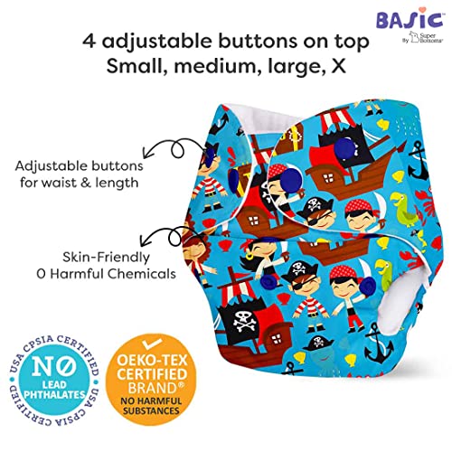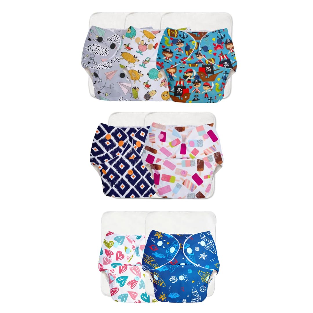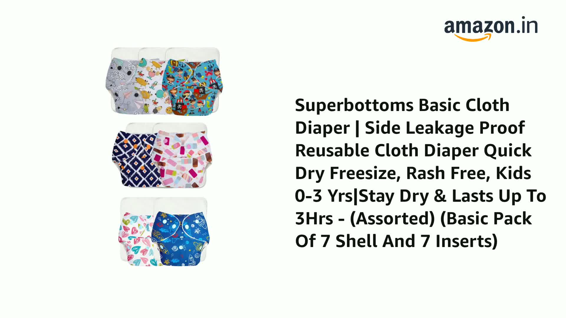 Contents: 2 trim diaper with stay dry lining and a opening 2 hourglass(contour) shape terry cotton insert SIZE: Free Size - Adjustable diaper (1 diaper= 4 different sizes) IDEAL AGE/ WEIGHT: 5kg 17 kg babies and toddlers3 months- 3 years A diaper that grows with your babyPRE- USE INSTRUCTIONS The diaper and soaker need to be washed once before use. They both are completely washable & reusable for atleast 300 times. HOW TO USE BASIC Cloth Diaper by SUPERBOTTOMS: STEP 1: ALWAYS wash the diaper atleast once before use using detergent Skipping this step CAN CAUSE leaks. STEP 2: ALWAYS size diaper before use using the front panel of snaps (check fit and size infographics). There are 12 snaps in front meant for reducing size. The size must be such that there are NO GAPS around the thigh. A loose diaper can be uncomfortable for babies. STEP 3: Snap on the insert to the diaper with help of the snaps or Insert the soaker/ insert in the diaper pocket. One soaker will last 2.5- 3 hours for an average wetting baby. If your baby is a heavy wetter please add additional inserts. You can also check out our bestseller Superbottoms Plus UNO AIO with 2 certified organic cotton inserts. WASH CARE: Before Washing : 1.If diaper has been pooped in knock poop off rinse diaper and keep in lightly covered bucket or wetbag 2. If diaper has been peed in it can be stored as it is till wash. Store in a lightly covered bucket or wet bag. WASH ROUTINE: 1. Prewash (Rinse thoroughly) 2. Main wash using regular detergent in sufficient quantity (not more or less) and wash well in machine or by hand - rub well. (Choose detergents like regular Surf which do not have softeners added fragrances etc. DO NOT use baby detergent 3.Machine dry/ line dry. Sun drying is ideal