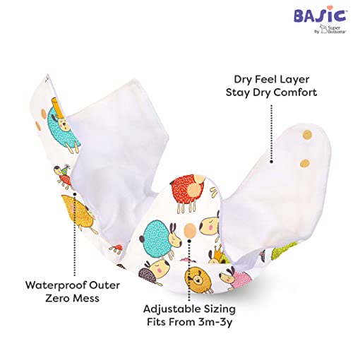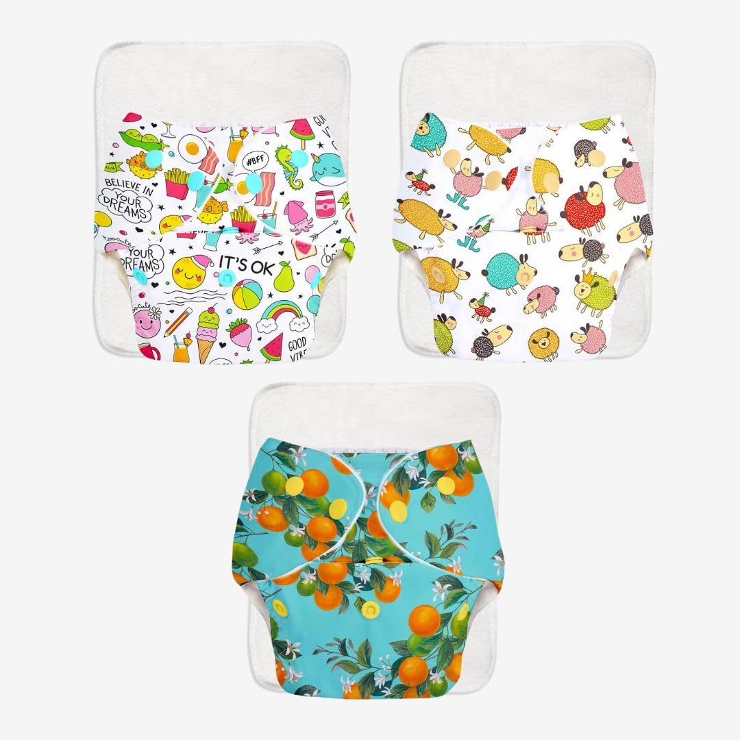 SuperBottoms BASIC EASY - Pack of 3 |3 Cloth Diapers+ 3 Inserts - Freesize Adjustable and Reusable Cloth Diaper for babies 0-3 Years | With quick drying prefold style soaker-Assorted