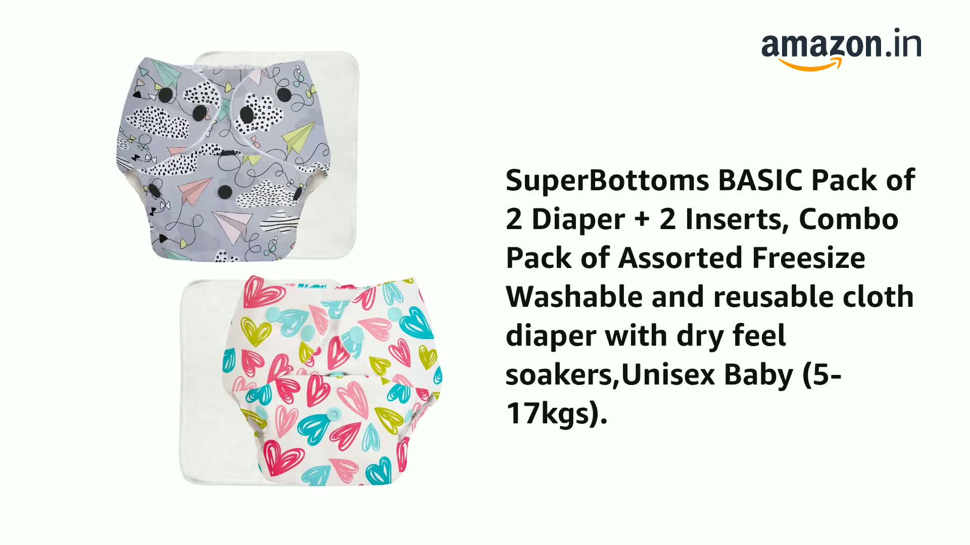 SuperBottoms BASIC Pack of 2 Diaper + 2 Inserts Combo Pack of Assorted Freesize Washable and reusable cloth diaper with dry feel soakersUnisex Baby (5-17kgs).