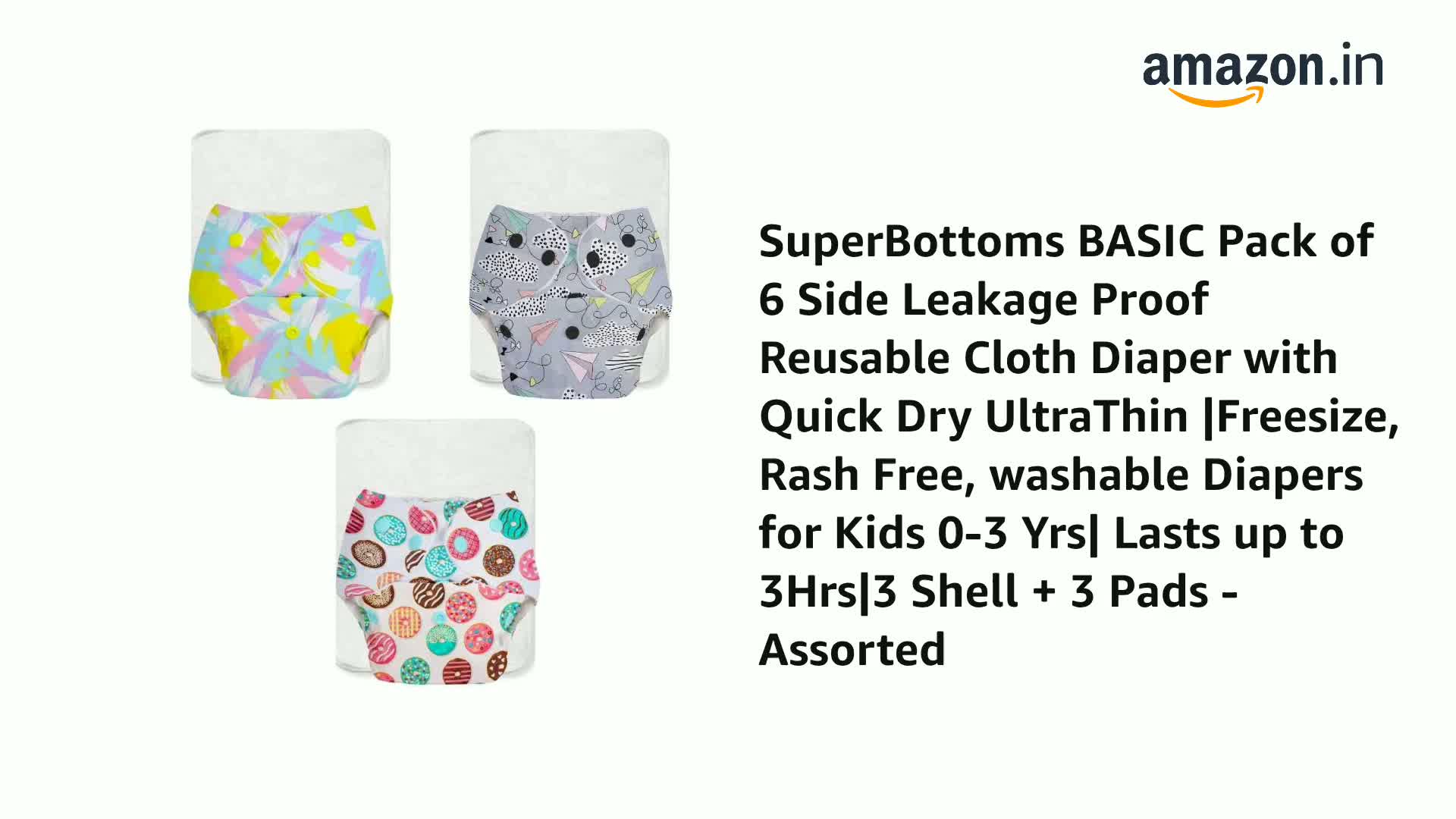 SuperBottoms BASIC Pack of 6 Side Leakage Proof Reusable Cloth Diaper with Quick Dry UltraThin |Freesize Rash Free washable Diapers for Kids 0-3 Yrs| Lasts up to 3Hrs|3 Shell + 3 Pads - Assorted