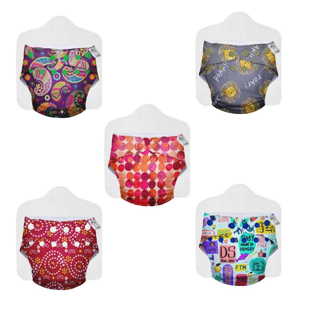 SuperBottoms Cloth Diapers for babies - Cloth Diaper Combo Pack of 5 Freesize UNO- New Version| Reusable Cloth Diapers for babies 3M to 3Y | With 5 organic cotton inserts/pads