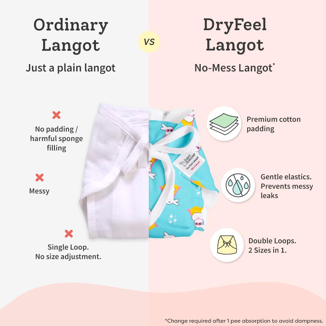 HomeBabyDiaperingCloth DiapersSuperBottoms First Love DryFeel Langot for Newborn Baby | No Mess Langot | Premium Cotton Padding (No Sponge) | Ultra-Soft | Mess-Free Diaper-Free Time | 0-9M | (Printed Pack of 3 Small)