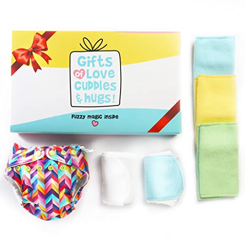 CONTENTS: The gift pack contains 1 Freesize UNO Washable Cloth Diaper - New Version (1 Waterproof Outer + 1 Dry Feel Magic Pad (Cloth diaper insert) with SuperDryFeel Layer) 1 Booster Pad (diaper soaker) and 3 Coloured Easy Clean Top Sheets (Fleece liners