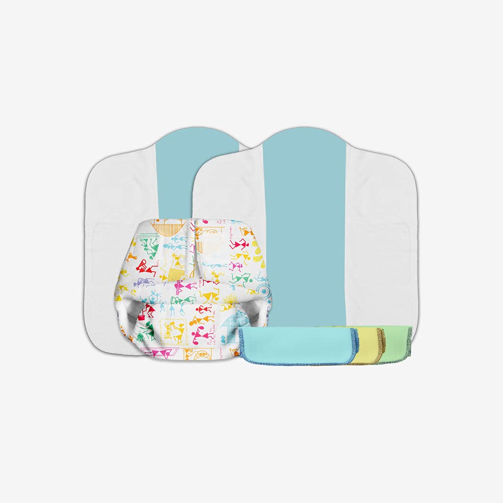 Superbottoms Newborn Gift Set - 1 Newborn UNO, washable and reusable diaper + 1 Dry Feel Pads (newborn size) + 3 Easy Clean Top Sheet - No Print choice, Assorted Prints