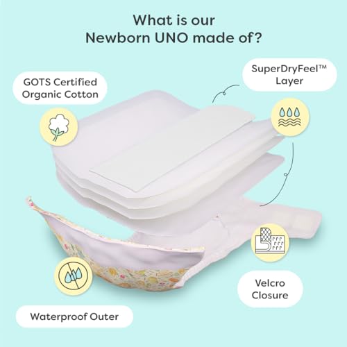 SuperBottoms Newborn UNO: Premium & Rash-Free Comfort From Day 0!Perfect for newborns weighing 2.57 kg (0 to 3 months).Introducing the SuperBottoms Newborn UNO a reusable and washable cloth diaper designed for your newborns comfort.This diaper is made from all-natural materials and contains no harmful chemicals making it the gentlest choice for your babys delicate skin. It gives you the convenience of a disposable diaper while keeping the benefits of cloth perfect for busy parents!The Newborn UNO has a soft waterproof outer layer made from velvety soft fabric and comes with a Dry Feel Magic Pad. Made from GOTS Certified 100% Organic Cotton it can absorb 4-5 pees keeping your newborn dry and comfy. Plus the Velcro closure makes it easy to put on and adjust!The special SuperDryFeel layer on top keeps your babys bum nice and dry even after they pee on it. Its designed for newborns up to 3 months old fitting babies weighing between 2.5 kg and 7 kg.Certified by CPSIA and OEKO-TEX the diaper is gentle on your babys sensitive skin.Loved by over 20 Lakh+ parents and recommended by paediatricians SuperBottoms is committed to giving your baby the best care without compromise.Note: Give them a wash before using for the best results!The Dry Feel Magic Pad may come with either a blue or white SuperDryFeel layer depending on whats in stock. But dont worryits performance will be just as great keeping your baby dry and comfy!