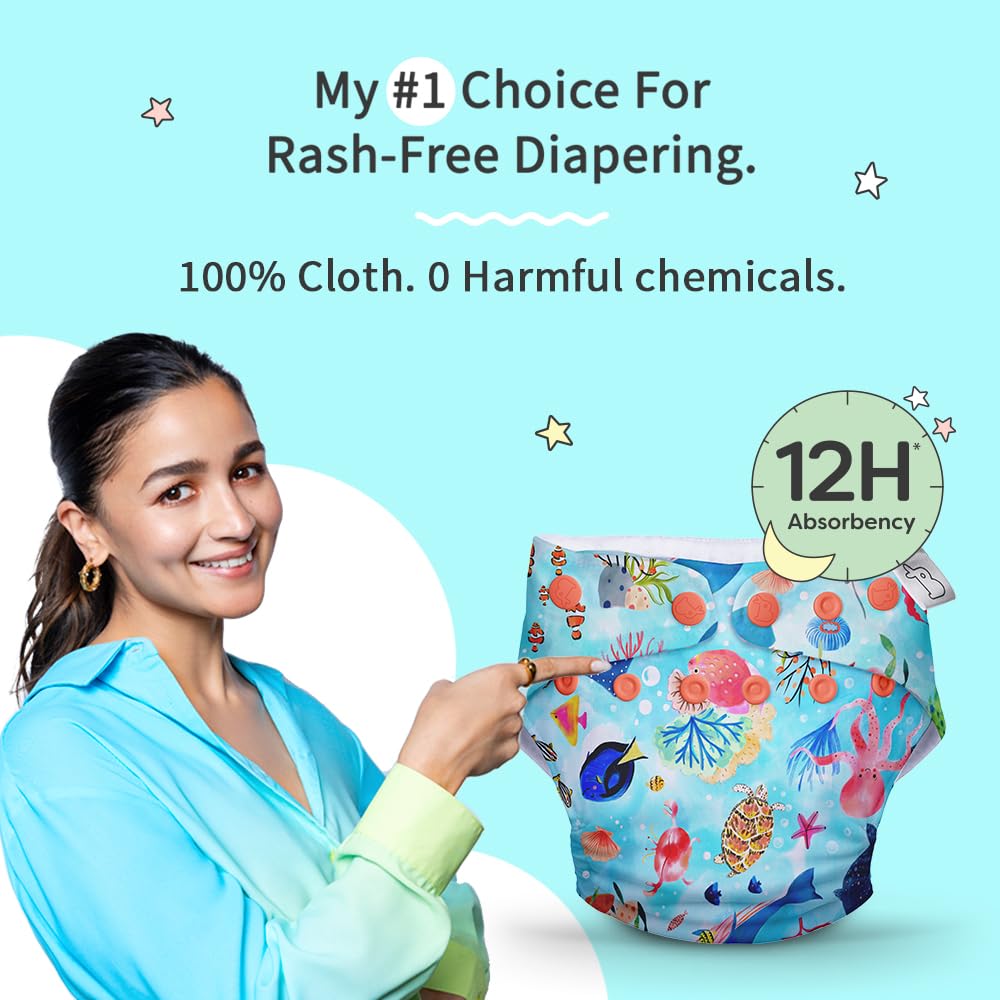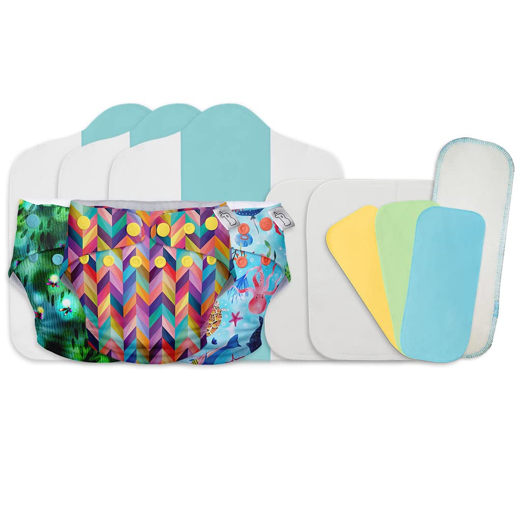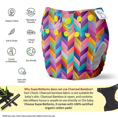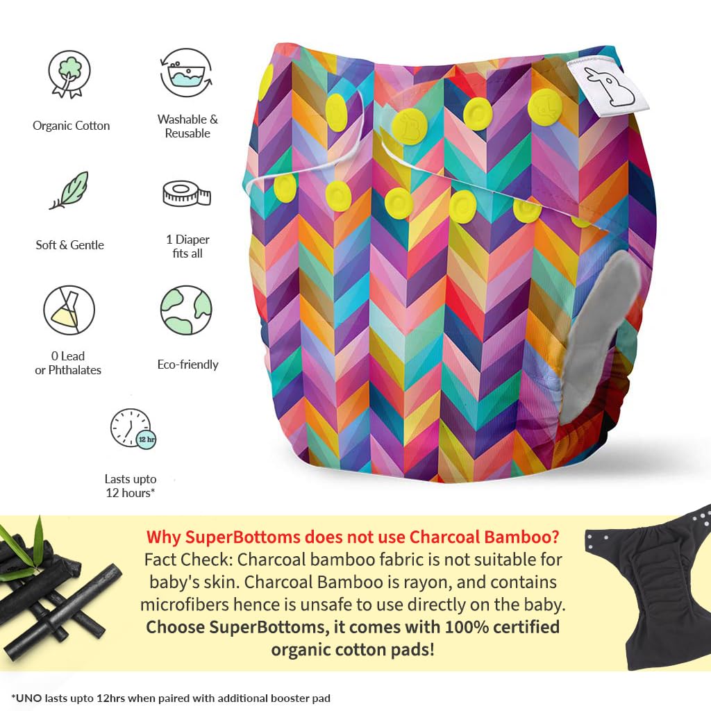 SuperBottoms Stash Builder Pack with 3 Freesize UNO- New version| Cloth diapers combo for babies from 3M to 3Y |With 3 Fleece liners 2 Booster Pads & 1 Very Heavy Wetter Pad (hemp insert)