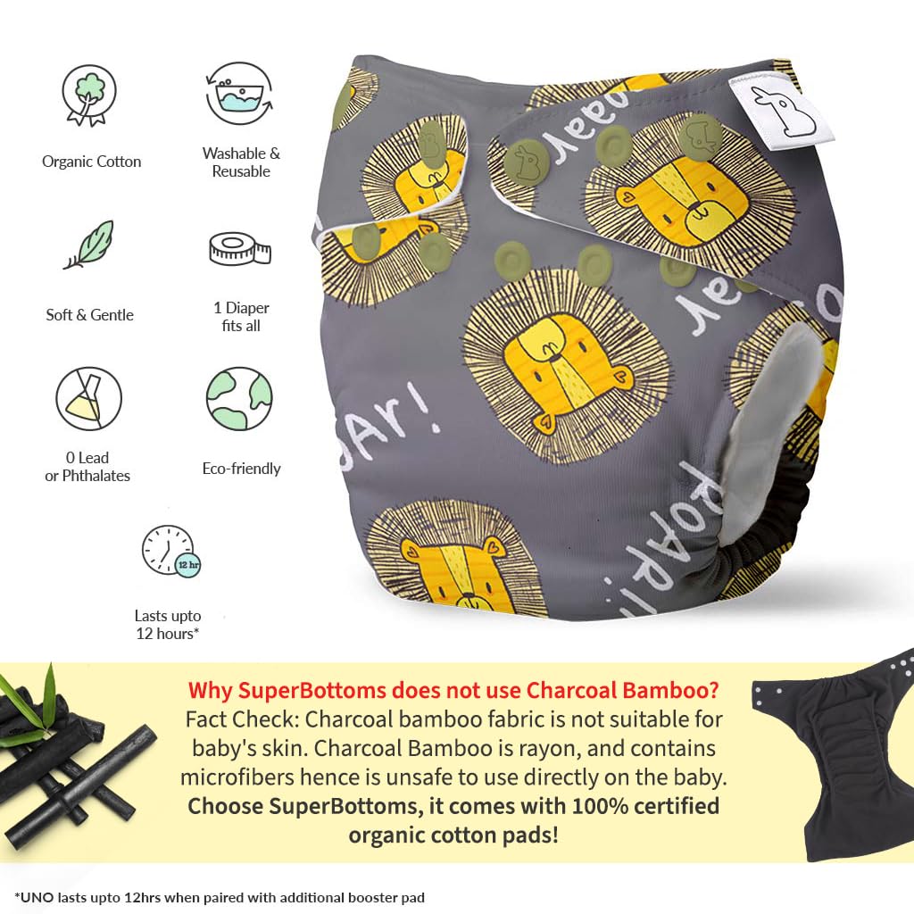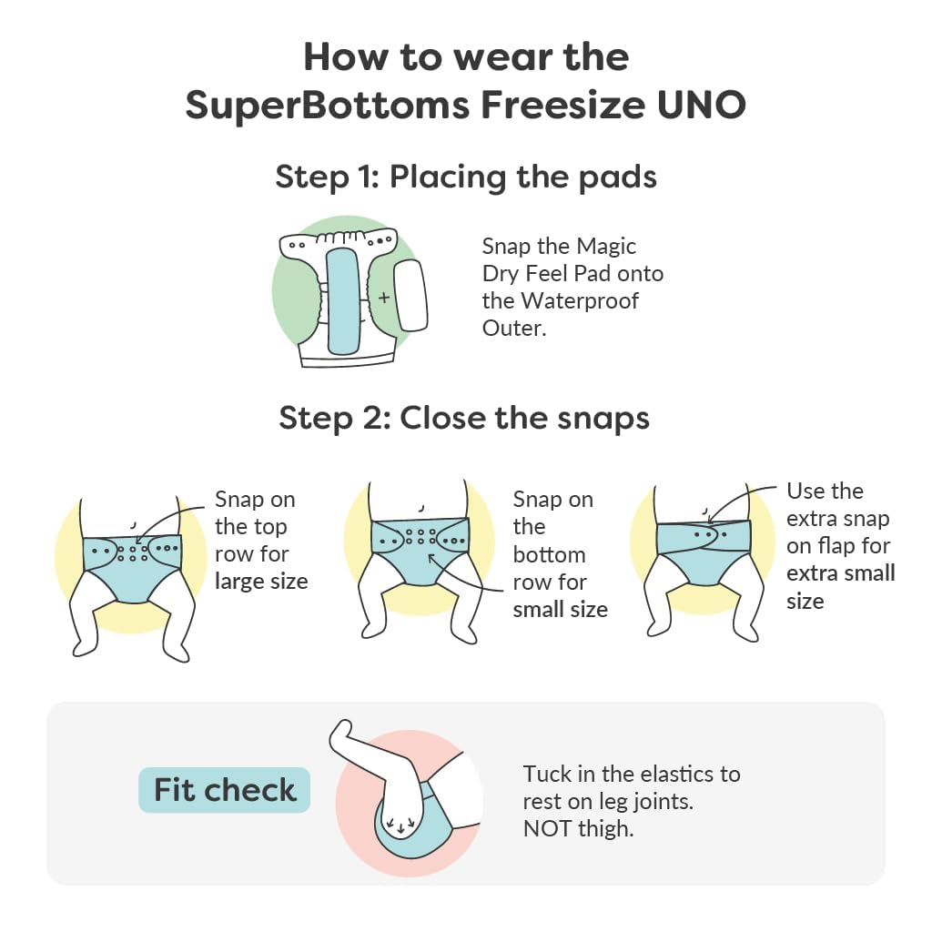 HomeBabyDiaperingCloth DiapersSuperBottoms Stash Builder Pack with 4 Freesize UNO- New version| Cloth diapers combo for babies from 3M to 3Y |Comes with 3 Fleece liners, 3 Booster Pads & 1 Very Heavy Wetter Pad (hemp insert)