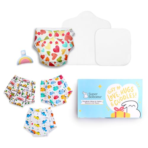 SuperBottoms Toddler Diapering & Potty Training Gift Pack- 1 Reusable Freesize UNO Cloth Diaper with 1 organic Cotton Insert Pad + 1 Booter pad + 3 Padded Underwear + 1 Charmling (3m- 3 yrs) (7 items)