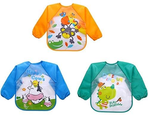 BabyGo Washable 3 Pcs Long Sleeve Bibs Waterproof Baby Bibs Toddler Sleeved Bib Baby Smock for Eating Feeding 6-24 Months (Multicolor)