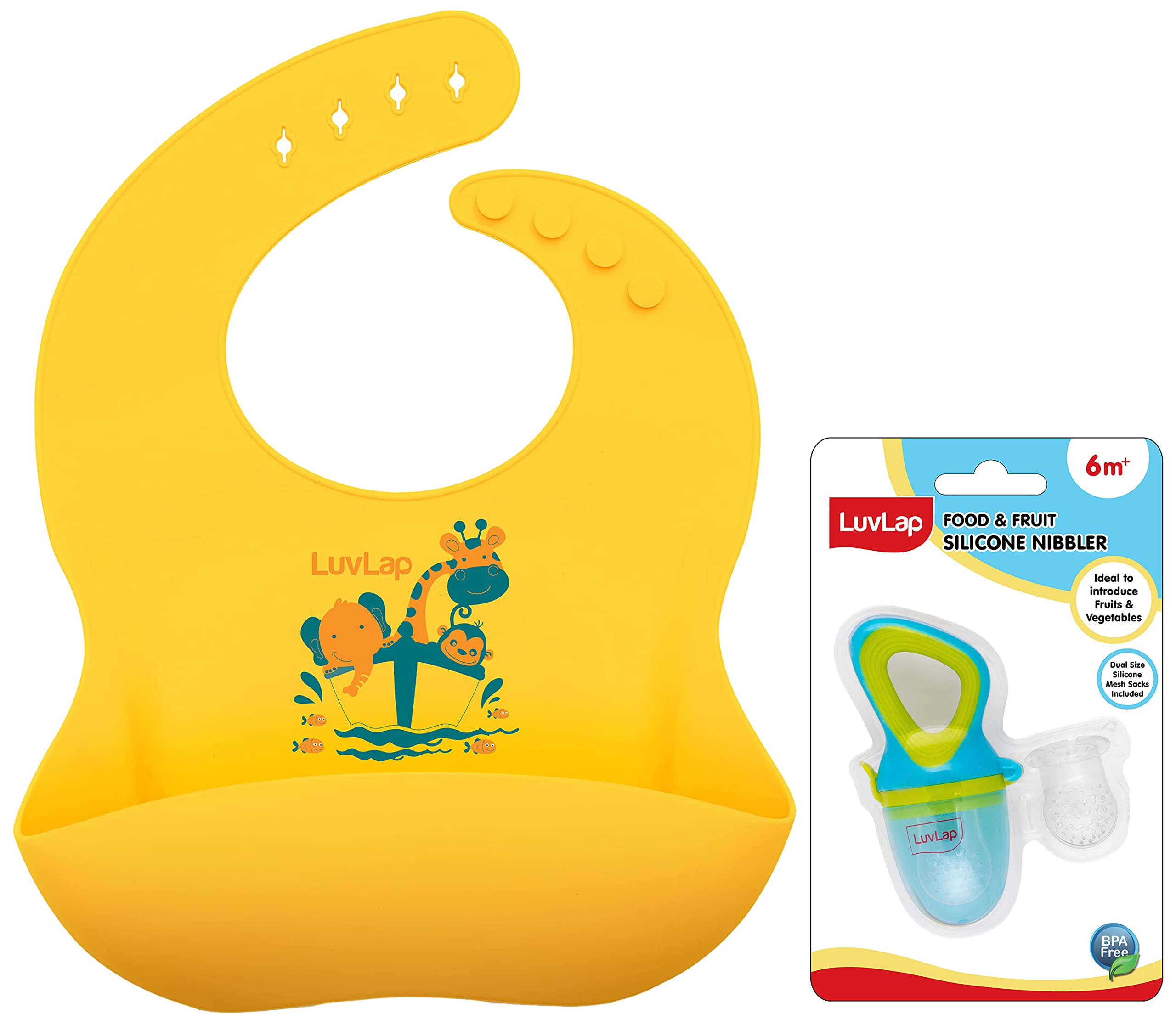 LuvLap Silicone Baby Bib for Feeding & Weaning Babies & Toddlers Waterproof Washable & Reusable Non Messy Easy Cleaning No Bad Odour Adjustable Neckline with Buttons (Yellow)LuvLap Silicone Baby Bib for Feeding & Weaning babies & Toddlers Waterproof (Yellow)LuvLap Silicone Food/Fruit Nibbler with Extra Mesh Soft Pacifier/Feeder Teether for Infant Baby Infant Elegant Blue BPA FreeFruit nibbler and teething toy to provide gentle relief to gums. Serves dual purpose of feeding fruit and vegetables to babies and can also be used as a teether. Can be filled with chilled fruits/vegetables to provide added relief. Made with bpa free food grade plastic and soft silicone it comes in attractive handle designs to EN gage the baby and is easy to hold and nibble upon.