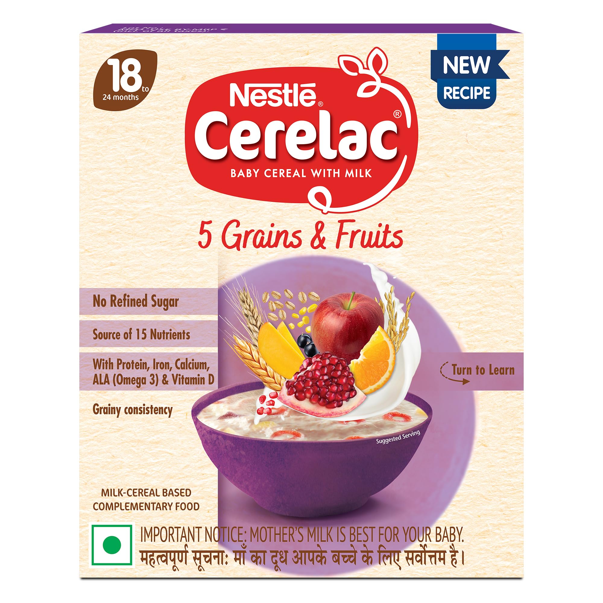 Nestle CERELAC 5 Grains and Fruits with No Refined Sugar is a complementary baby food for infants from 18 to 24 months. It is also a source of 15 important nutrients including vitamins and minerals. With Protein Iron Calcium ALA (Omega 3) & Vitamin D. This baby food cereal is packed with the goodness of cereal milk and fruit. With 155 years of scientific expertise in infant nutrition Nestle develops infant nutrition products backed by evolving science and research. Innovation has been at the heart of Nestle since its beginning. Contains no Refined Sugar. Storage Instructions: Store unopened pack in a cool and dry place. After opening use the contents within 3 weeks or the expiry date whichever is earlier. Prolonged storage and exposure to air may result in infestation & off odors & taste. On opening transfer the contents of the pack along with the pouch into a clean airtight container. After each use close lid tightly and store in a cool dry and hygienic place. Important Notice: Motherâs milk is best for your baby. Warning/Caution : Careful and hygienic preparation of infant food is most essential for health. Do not use fewer scoops than directed since diluted feeding will not provide adequate nutrients needed by your infant. Do not use more scoops than directed since concentrated feed will not provide the water needed by your infant. Infant food shall be only used on the advice of a health worker as to the need for its use and the proper method of its use Safety warning: Infant food is not the sole source of nourishment of an infant. Boiled and cooled water shall be used to prepare this product and any leftover product must be discarded to reduce the risk of infection Use prepared feed within half an hour otherwise microbial deterioration may set in. Discard unused feed. The scoop provided with this pack should be thoroughly washed and dried before use Allergen note: Contains Wheat Milk Oats and Barley.