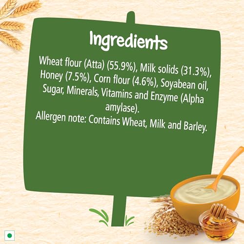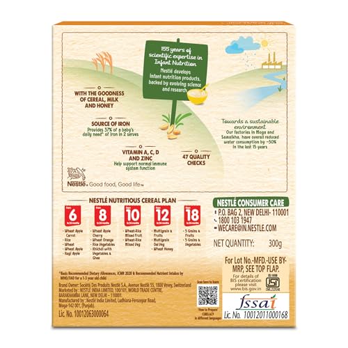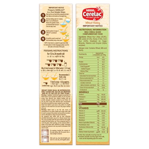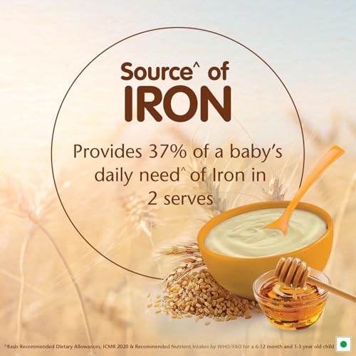 Nestle CERELAC Wheat Honey is a complementary baby food for infants from 12 to 24 months. 2 serves of CERELAC Wheat Honey Cereal provide 37% of a babyâs daily need of iron. It is also a source of 14 important nutrients including vitamins and minerals. This baby food cereal is rich in protein and packed with the goodness of cereal milk and honey. With 155 years of scientific expertise in infant nutrition Nestle develops infant nutrition products backed by evolving science and research. Innovation has been at the heart of Nestle since its beginning. Storage Instructions: After opening the pack the contents should immediately be transferred to an empty clean dry and airtight container. After each use replace lid tightly & store in a cool dry and hygenic place. Important Notice: Motherâs milk is best for your baby. Basic Recommended Dietary Allowance ICMR 2020 & Recommended Nutrient Intake by WHO/FAO for a 1-3 year old child. Safety Warnings: Infant food should be used only on the advice of a health worker as to the need for its use and the proper method of its use. Infant food is not the sole source of nourishment for an infant. Use prepared feed within half an hour otherwise microbial deterioration may set in. Discard unused feed.