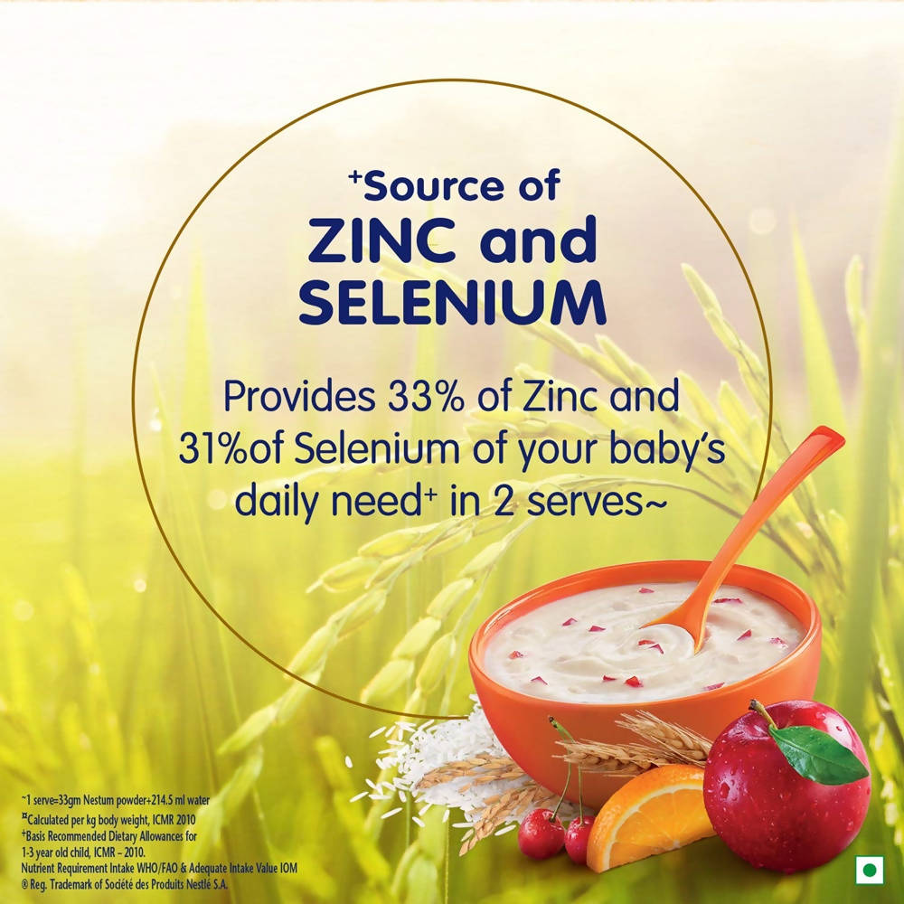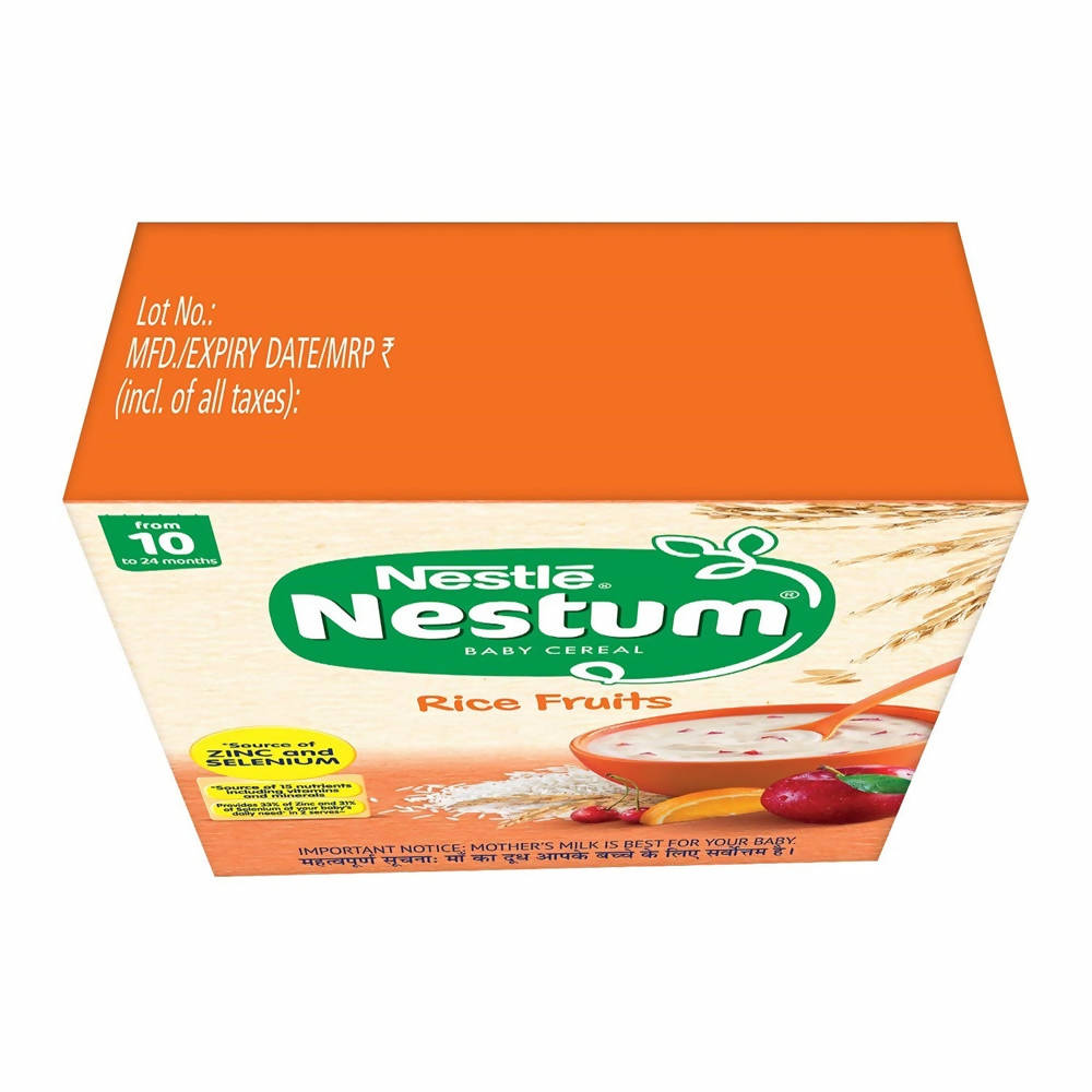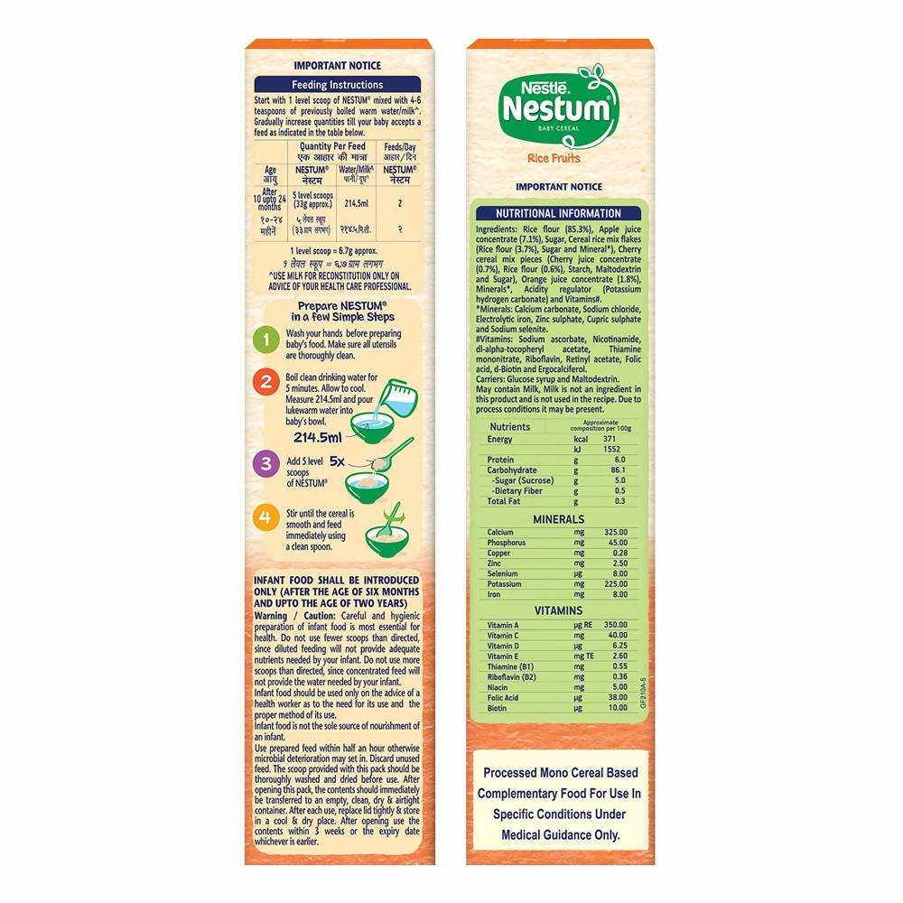 Nestle Nestum Baby Cereal-Rice Fruits From 10 to 24 months: 300 gmIngredients:Rice flour, Apple juice concentrate, Rice crisp, Cherry crunchies, Minerals, Orange juice concentrate, and VitaminsDirections:Boil milk. Allow it to cool downPour milk into baby's bowl and add NestumStir until the pap is smooth. Feed your baby with a clean spoon.Also, Ingredients like fruit juices and mashed fruit, cooked and pureed spinach, boiled and mashed dals, cooked and mashed vegetables and curds, can be added to already prepared NESTUM, to make nutritious feeds for the babies.Safety Warnings:Careful and hygienic preparation of infant food is most essential for health. Do not use fewer scoops than directed, since diluted feeding will not provide adequate nutrition needed by your infant. Do not use more scoops than directed, since concentrated feed will not provide the water needed by your infant. Infant food should be used only on the advice of a health worker as to the need for its use and the proper method of its use. The world health organization recommends exclusive breastfeeding for 6 months. Nestlé supports this recommendation. Since babies vary in their needs, consult your healthcare professional for advice on when to introduce caerelac to your child. Breastfeeding should continue for as long as possible after the introduction of weaning foods.Legal Disclaimer: The product is guaranteed to be 100% genuine. Product images are