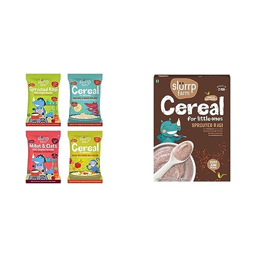 Slurrp Farm No Sugar No Salt Cereal Starter Combo | Made with Ragi Oats Jowar Real Fruits Vegetables Dals | Healthy Food for Kids | Easy to cook | 50 g*4 Convenient trial size packs of 50g each of Organic Sprouted Ragi Millets and Oats porridge Ragi Banana with Milk Cereal and Moong Dal Khichdi Cereal No sugar salt preservatives artificial colours or flavours | Easy to digest single and multigrain cereals: ideal early foods for little ones Sprouted Ragi is a powerhouse of calcium: 10x that of wheat and rice | Millets and Oats porridge is packed with fibre Banana Cereal and Moong Dal Khichdi cereal contains 13 essential vitamins and minerals. 2 serves of Banana cereal provide 60% of your toddler daily iron needs basis who guidelines Traditional and wholesome foods made by Two MothersSlurrp Farm Sprouted Ragi Powder |100% Natural Ragi Flour/Nachni Flour/Ragi Satva/Kodra/Taidalu/Kezhvaragu/Finger Millet Flour| No Milk No Sugar No Salt | 250gSlurrp Farm is founded by two mothers for their children and yours. Our mission is to provide tasty and all natural alternatives to the junk food that surrounds us today. This means no preservatives no artificial flavours and no artificial colours. We are passionate about raising awareness of healthy eating for children by giving parents convenient food options which are as good as what we would make at home.