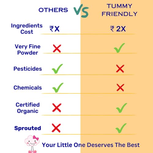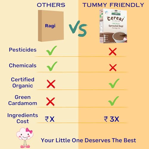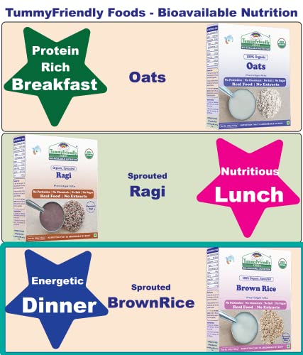 TummyFriendly Foods Certified Organic Sprouted Ragi Flour For Little Ones. Made of Organic Sprouted Ragi Powder | Ragi Flour for Baby rich in Calcium Iron Fibre & Micro-Nutrients. Ragi Sari Nachani Satva. No Sugar No Salt No Milk No Chemicals No Pesticides | Maximum Nutrition From Real Food. Available in Trial Baby Packs too. Shelf Life 6 Month | 200g ONE PACKExcellent source of Calcium and Iron Good source of Protein Vitamins and Minerals Rich in Dietary-Fibre for a Happy-TummyTummyFriendly Foods Certified 100% Organic Sprouted Brown Rice Porridge Mix | Excellent Weight Gain Food | Made of Sprouted Brown Rice Powder For Baby | India-Organic Certified | Maximum possible Nutrition From Real Food | No Sugar No Salt No Milk No Chemicals No Pesticides & No GMO | Available in Trial Baby Packs too | 6 Month Shelf Life | 200g♥ Certified 100% Organic Brown Rice Porridge Mix-200g ♥ Why Sprouting? Because when sprouted the grains & pulses germinate into Baby plants with the nutritional capacity to grow into big plants. ♥ The germination process in Brown Rice is known to multiply the levels of Gamma-Aminobutyric Acid (GABA) a neurotransmitter that strengthens the central nervous system. ♥ Sprouted Brown Rice is known to have high levels of Manganese an essential mineral for bone health and nutrient metabolism. ♥ Sprouted Brown Rice is a good source of Folate Thiamine Niacin and other B-Complex Vitamins. ♥ Sprouted Brown Rice is a very good source of Selenium Phosphorus Magnesium and Zinc. ♥ Sprouted Brown Rice is laden with nutrients it helps support the rapid growth cycles year by year in little ones. ♥ Certified Organic Food For Babies ♥ Easily digestible ♥ 6+ month Shelf-Life ♥ TummyFriendly Foods: Maximum possible nutrition from Real-Food ♥ No Sugar No Salt No Chemicals No Pesticides No GMO No extracts and No Unhealthy Ingredients. ♥ Only Real Food!