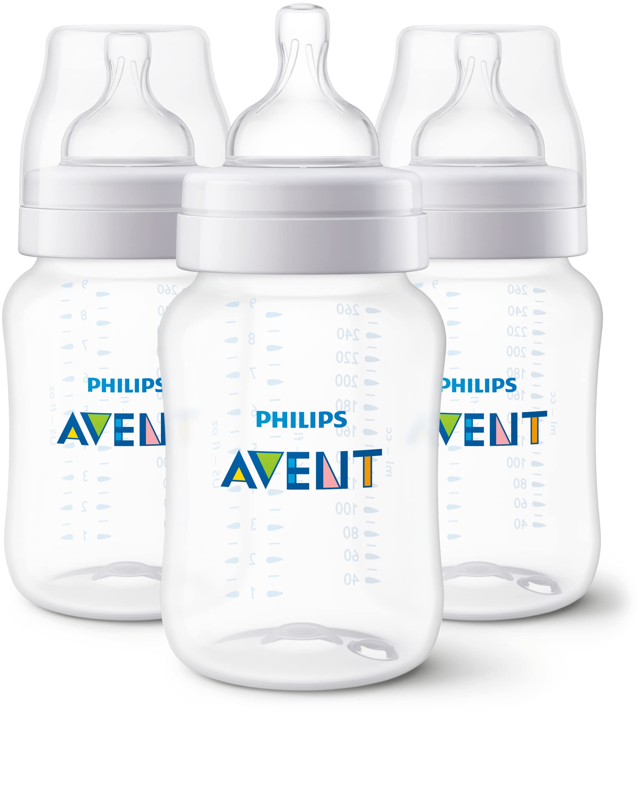 With its integrated Anti-colic valve air is vented into the bottle and away from the baby's tummy. Our clinically proven* Anti-colic valve is designed to reduce colic and gas. Clinical studies have shown that the Philips Avent bottle reduces colic and fussing. Fussing is significantly reduced at night as babies fed with Philips Avent Anti-colic bottles experienced 60 % less fussing than babies fed with a leading competitorâs vented bottle.* The nipple shape allows secure latch and the ribbed texture helps prevents collapse for uninterrupted comfortable feeding. Our Anti-colic bottle is designed to prevent leakage whilst feeding for a truly enjoyable feeding experience. With its wide neck and fewer parts our bottle is easier to assemble and to clean quickly and thoroughly. Philips Avent Anti-colic bottle is made of BPA free material (PP). Philips Avent Anti-colic nipples are available in different flow rates (0m+ 1m+ 3m+ & 6m+) to keep up with your babyâs growth. We recommend replacing nipples every 3 months for hygiene reasons. Use Philips Avent Anti-colic bottles only with Philips Avent Anti-colic nipples. Full Compatibility with Philips Avent Anti-colic bottle with or without AirFree vent. Includes 1 bottle. * At 2 weeks of age babies fed with a Philips Avent bottle showed less colic and significantly less fussing at night compared to babies fed with another leading bottle. * Nipple design proven to prevent nipple collapse and associated air ingestion and feeding interruptions.
