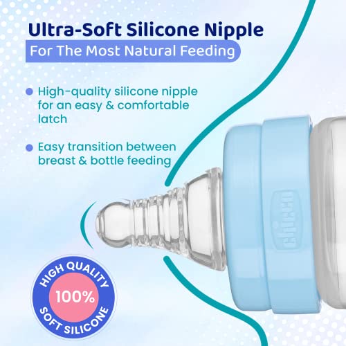 Chicco Feed Easy Milk Feeding Bottle for Babies & Toddlers, V-Shaped Anti-Colic System to Prevent Colic, Gas & Discomfort, For Comfortable latch, Ultra-Soft Silicone Nipple, Spill-Proof Cap & Stopper, BPA-free, Medium Flow, 2m+ (250 ml Bottle, Blue)