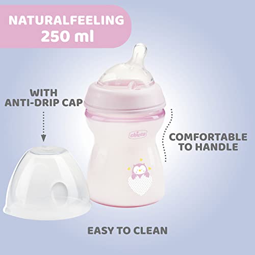 Chicco Natural Feeling Feeding Bottle for Babies, 250ml (2+ Months) |Mother Breast Like Teat| Soft Silicon, Anti-Colic Teat | Angled Teat Suitable for Newborns | with Anti-Drip Cap | BPA Free (Pink)