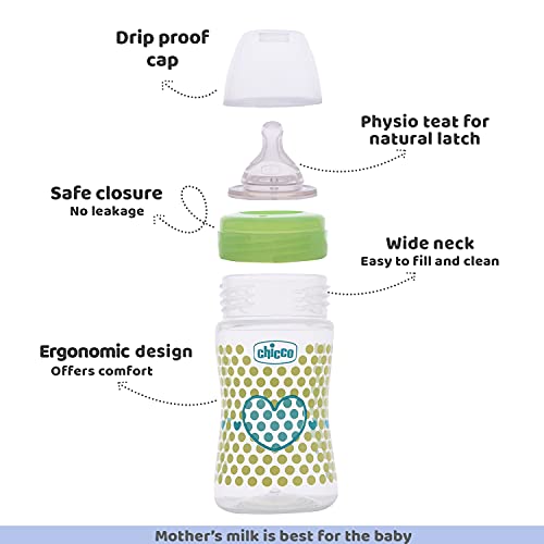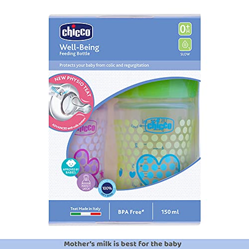Chicco Well-Being Feeding bottles are especially designed to provide the baby with a comfortable and relaxed feeding experience. To give baby the natural feeding experience Well-Being feeding bottle comes with an advanced teat i.e. Physio teat whose shape has been inspired from the shape of the motherâs nipple to promote the babyâs natural sucking movement. The anti-colic valve situated at the base of the teat helps to prevent the ingestion of air and promotes a constant flow of milk thus reducing the risk of colic regurgitation hiccups or any discomfort to the baby. The symmetrical elongated and flattened shape of the Physio teat that mimics the motherâs nipple fits perfectly to the babyâs mouth and promotes the physiological movement of babyâs tongue. Making it more preferable for babies the soft and hygienic silicone teat gives a soothing and pleasant feel to the baby helping in easy transition between breastfeeding and bottle feeding and vice-versa. The ergonomic shape of the bottle is easy to hold and grip even by babyâs little hands. Chicco Well Being Bottle is made with high-quality BPA-free polypropylene material that ensures maximum protection and hygiene. For parentâs ease the bottle has a wide neck design which provides easy and quick filling and is effortless to wash. Drip poof cap and bottle gear ensure safe closure and no leakage from the bottle. Easy to clean the Chicco Well-Being baby bottles are available in beautiful colours & decorations and are ideal for babyâs everyday feeding routine.