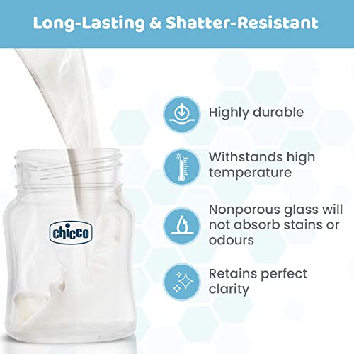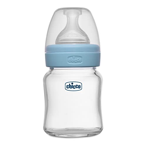 HomeBabyFeedingFeeding AccessoriesChicco Well-Being Glass Feeding Bottle for Babies (120ml, Slow Flow) | Premium Borosilicate Glass for High Durability | Elongated Teat for Correct Latch | Comes with Anti-Spill Cap | BPA Free (Blue)