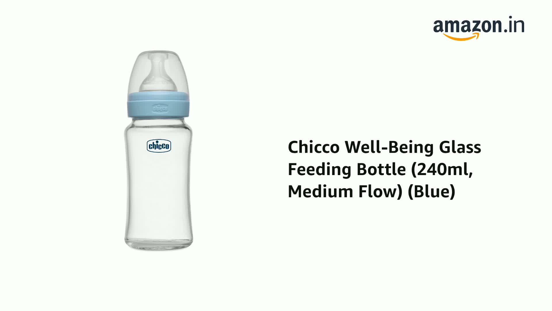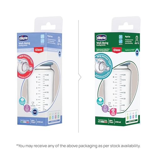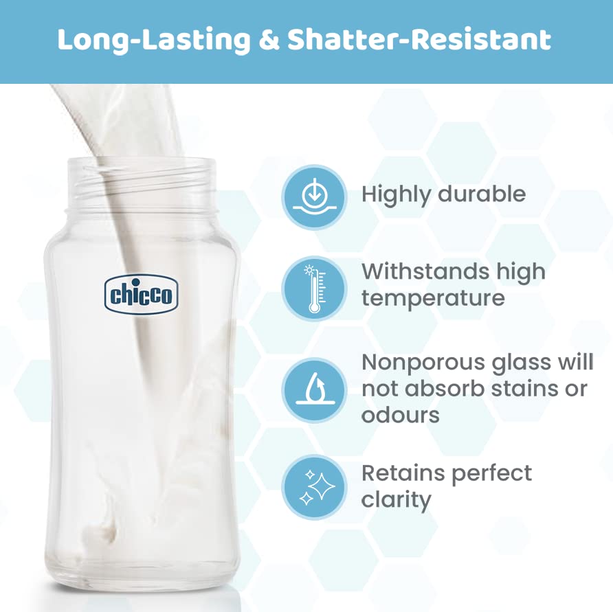 HomeBabyFeedingFeeding AccessoriesChicco Well-Being Glass Feeding Bottle for Babies (240ml, Medium Flow) | Premium Borosilicate Glass for High Durability | Elongated Teat for Correct Latch | Comes with Anti-Spill Cap | BPA Free (Blue)