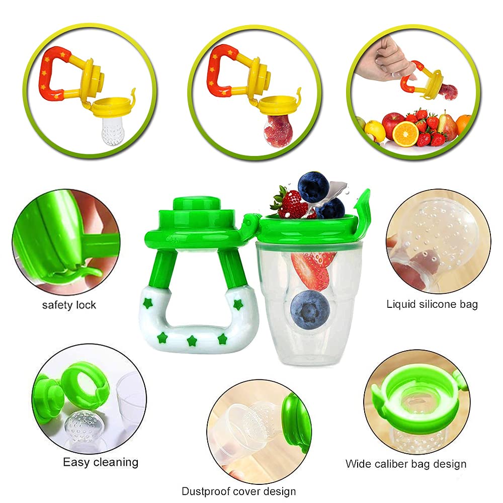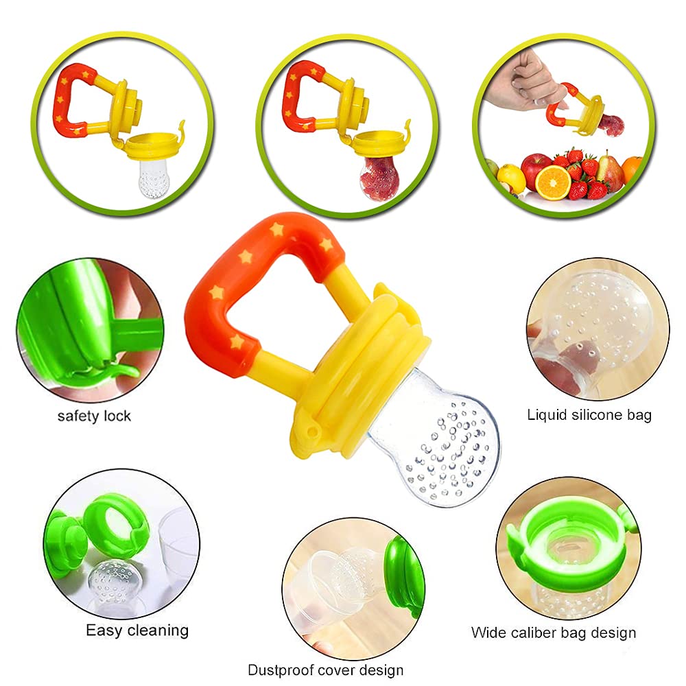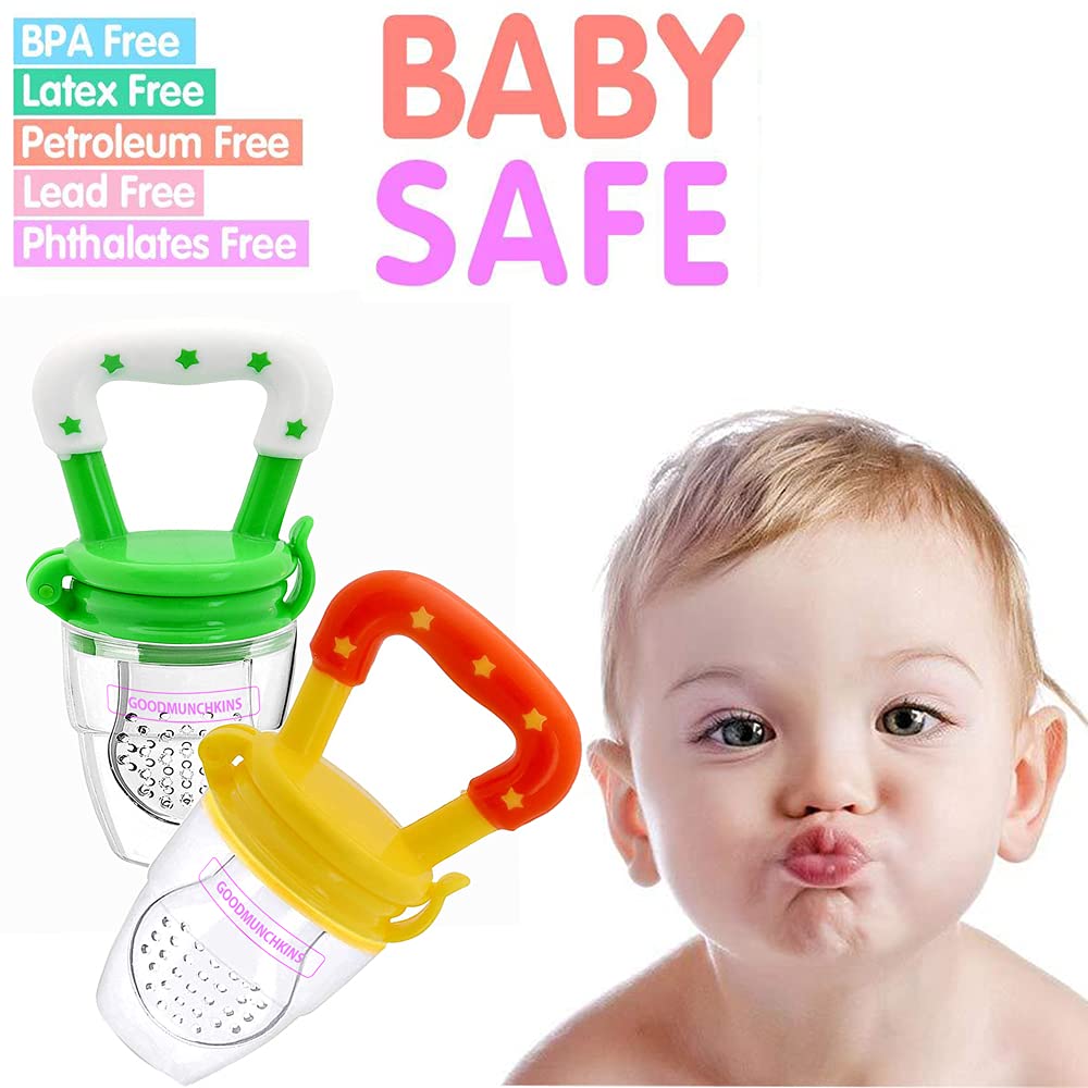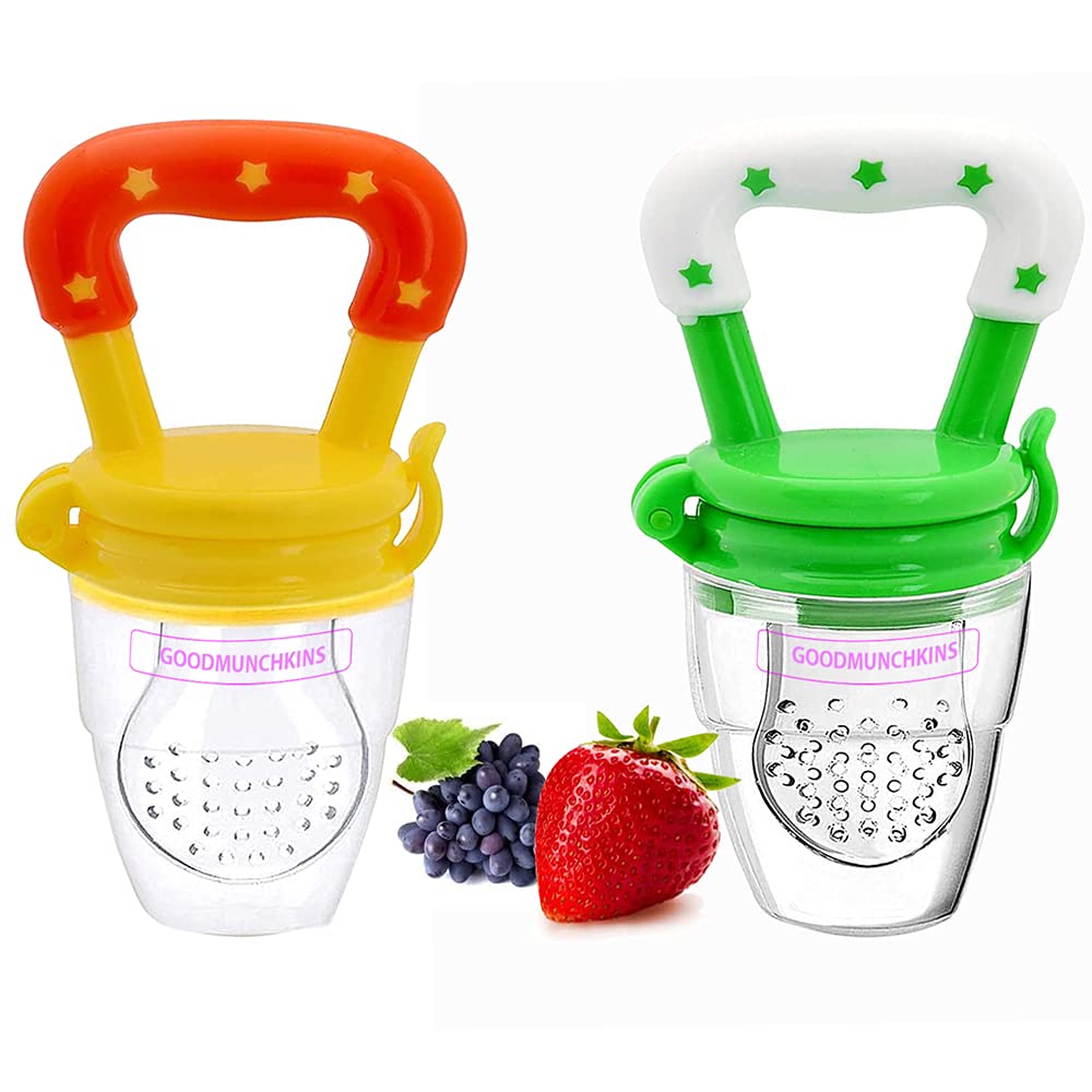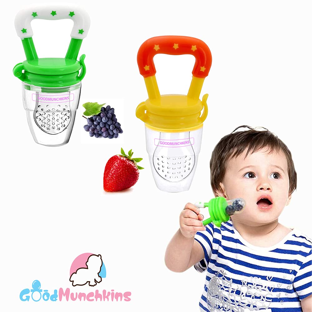 Silicone Fruit Feeder/Nibbler Baby fruit feeder pacifier comes with a hygienic cover to keep food clean and to avoid dust Feeding fruits for babies is now easy with the Goodmunchkins Fruit Nibbler. Easy for the baby to chew and suck the fruits through small sized holes. Lightweight and Portable Soft handle for the baby to hold the fruit to nibble. Fruit Nibbler is BPA Free & Non-Toxic Easy to clean and sterilize the fruit feeder