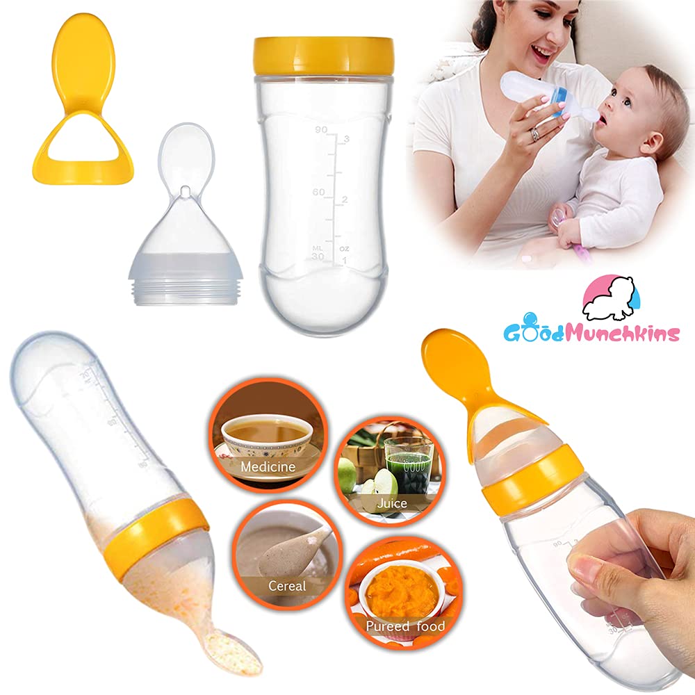 GOODMUNCHKINS-Silicone Spoon Food Feeder & Fruit Feeding Nibbler Silicone Spoon Feeder makes baby feeding easy for Parents. Ideal for 6 months and up babies this all-in-one feeder makes it a lot quicker and easier to feed a fussy baby.. The Baby Feeder spoon and bottle are made of food-grade silicone Soft enough to touch babies mouth. Clean the Silicone Spoon Feeder before use all parts can be sterilized or boiled in water for 3 to 5 minutes. A convenient way to feed your baby first pureed foods and cereals and help make feeding time easier and less messy. Gently squeeze the Spoon Feeding Bottle until the desired amount of food collects onto the spoon to feed baby.