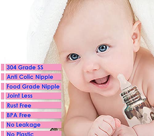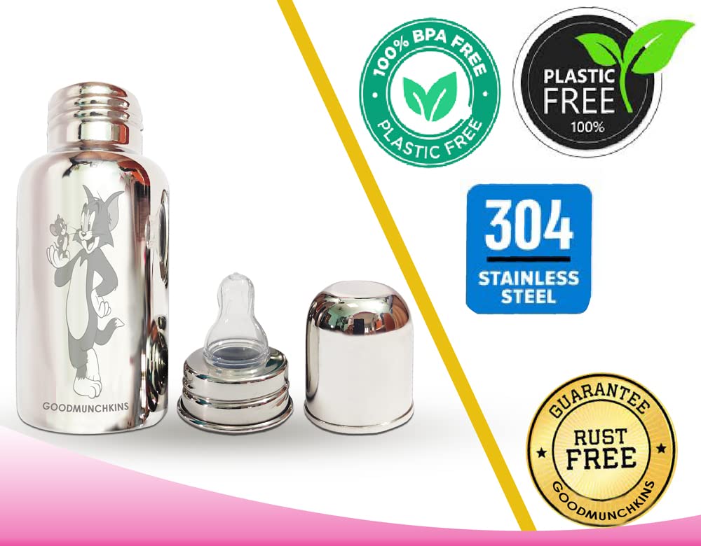 Goodmunchkins Stainless Steel Feeding Bottles opt for Newborn Baby/Infants/Toddlers. The size available 75150300ml Capacity. The Bottle is made of 304 Grade Steel without any welding Joints in the Bottle hence there is Rust Free Insides and Outside of the Bottle considering the Hygiene and Health of your Baby. The Bottle is made 100% with No Leakage on the neck side There are more quality checks Before Dispatching the Bottle to the Customer. Mirror finishing Bottle we can store Milk/Water/Juice/Soup. Lightweight so baby can hold it easily at the same time it very strong product. The Nipple is made of Food Grade Silicone. Extra soft medical-grade silicone spout provides an easy transition from bottle-feeding. Smooth Design with no sharp curves or edges keeping in mind Easy and Safe cleaning of the bottle. Easy to Carry Easy to Handle and Easy to Clean. No smell. No mess. The bottle is of sleek design and is very convenient while handling. Reduces sterilization work. Only Silicon Nipple needs to be sterilized. The bottle can be washed with Soap and Water Made in India.