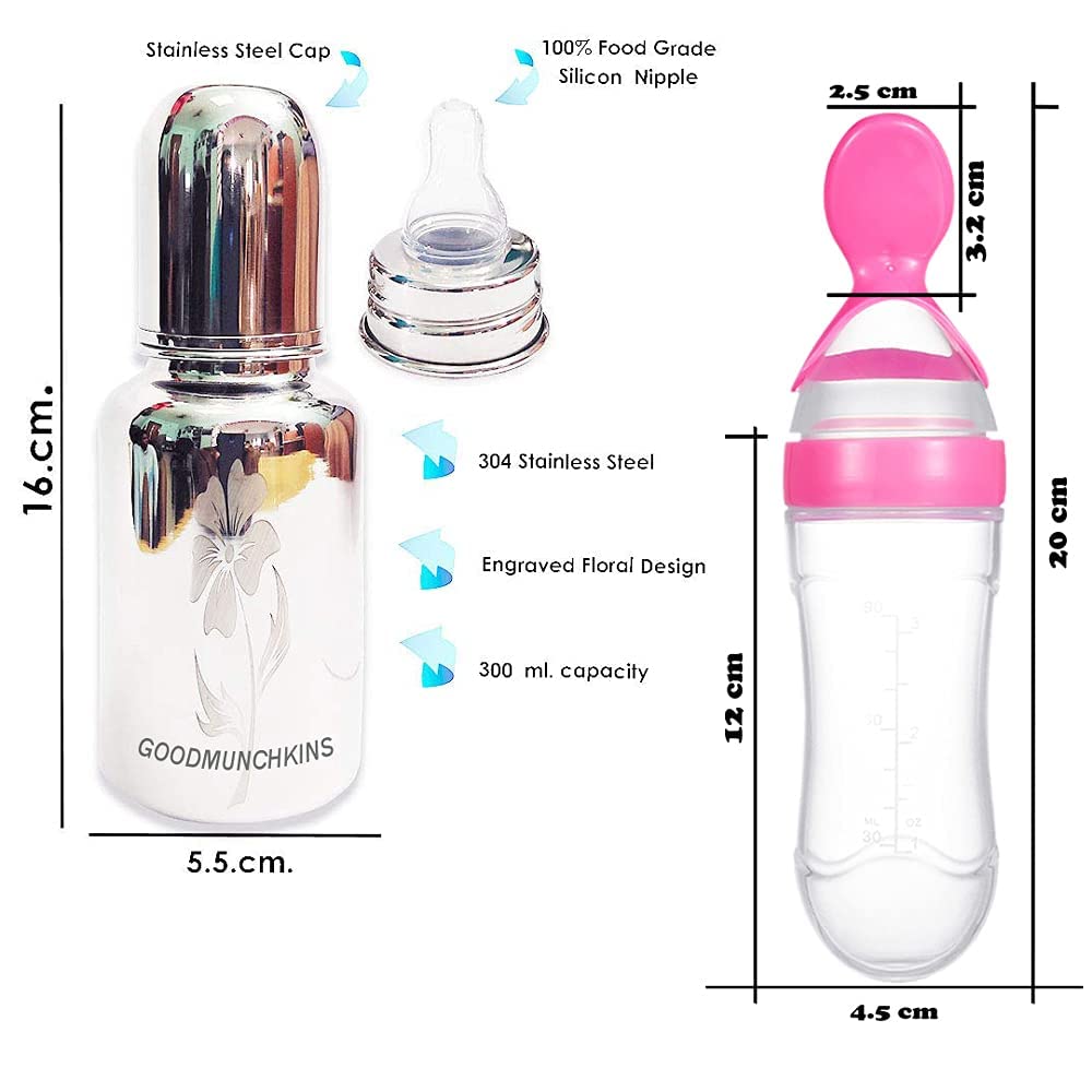 GOODMUNCHKINS Stainless Steel Baby Feeding Bottle - Silicon Food Feeder Silicone Spoon Feeder makes baby feeding easy for Parents. Ideal for 6 months and up babies this all-in-one feeder makes it a lot quicker and easier to feed a fussy baby. Baby Spoon Feeder has a stand-up design for convenience and hygiene.The Baby Feeder spoon and bottle are made of food-grade silicone Soft enough to touch babies' mouth. Clean the Silicone Spoon Feeder before use all parts can be sterilized or boiled in water for 3 to 5 minutes. A convenient way to feed your baby first pureed foods and cereals and help make feeding time more easier and less messy. Gently squeeze the Spoon Feeding Bottle until the desired amount of food collects onto the spoon to feed the baby.