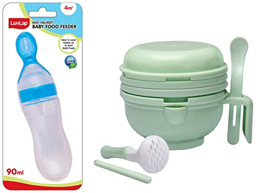 LuvLap 9 in 1 Baby Food Masher Mill Food Grinder Cum Processor with Multifunction Textured Mashing & Filtering Plates with Serving Bowl (Light Green)LuvLap 9 in 1 Baby Food Processor is Made of BOA Free PP material. It is nontoxic odor free and tasteless. It's different types of grinding modes include juicing filtering crushing and holding food. It could be used to grind fruits & vegetables meat and fishes into smooth paste. Different grinding filter has different use thegrinding filter with a lot of triangle bulges is for making blanketcarrot or cucumber the filter covered with small holes is used formaking fruit juice.It is easy to clean. Just rinse it with running water & let it dryLuvLap Feeding Spoon with Squeezy food Grade Silicone Feeder bottle For Infant Baby 90ml BPA FreeBlueSoft Silicone food feeding bottle with spoon can be used to feed puries juice milk or water to babies. Helps in easy transition. Effortless one hand feeding. Dust cover and disk make it easy to keep and carry.
