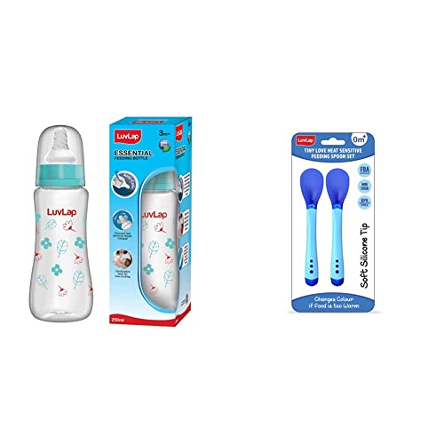 LuvLap Anti-Colic Slim / Regular Neck Essential Baby Feeding Bottle 250ml New Born / Infants / Toddler upto 3m+ Wild Flowers BPA FreegreenLuvLap Essential Feeding Bottles are ergonomically designed to be easily held while feeding the baby. All LuvLap bottles are 100% BPA free and fully sterilizable. The teats are 100% Liquid Silicone and have an anti-colic valve that vents air into the bottle preventing any air from entering the babys tummy. The teat has spiral grooves at the tip which encourage peristaltic suckling and help the baby get a comfortable latch. The grooved teats and superior silicone quality ensure no nipple collapse helping in an uninterrupted feed. With the LuvLap Essential Feeding Bottles at your side your babys feed will always be a comfortable oneLuvLap Tiny Love Heat Sensitive Baby Feeding Spoons Set Food Grade PP Kids & Baby Spoon with Soft Silicone Tip Color changing BPA Free FDA Apporved 2 pcs BlueLifeÂs little stories bloom with coming of the little one in your life. It completes your life with many joys of parenthood. For baby itÂs the next best thing to being in your arms. Entertain your little one and give him or her a personal resting place. LuvlapÂs high chairs cots walkers and other indoor products will have the whole household floored by babyÂs happy smiles and chuckles. At Luvlap we endeavour to weave the little stories into our products with an emphasis on child safety and enrichment of features. So that your little one gets the comfort thatÂs next only to the warmth of your lap. Conceived with care and made using the latest marvels of science all Luvlap products undergo multiple quality checks before they are dispatched to the stores. The products are available at all leading baby gear and online stores and conform to the european standards.